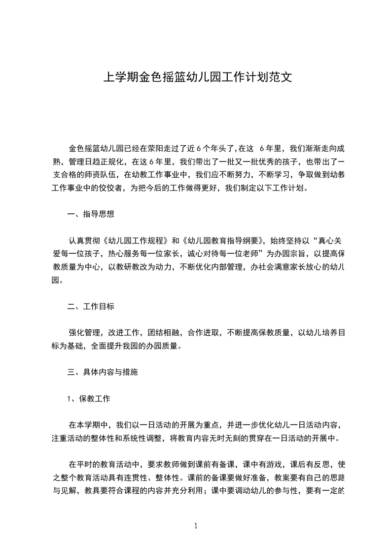 金色摇篮幼儿园已经在荥阳走过了近6个年头了,在这6年里,我们渐渐走向成熟,管理日趋正规化,在这6年里,我们带出了一批又一批优秀的孩子,也带出了一支合格的师资队伍,在幼教工作事业中,我们应不断努力,不断学习,争取做到幼教工作事业中的佼佼者,为把今后的工作做得更好,我们制定以下工作计划。
