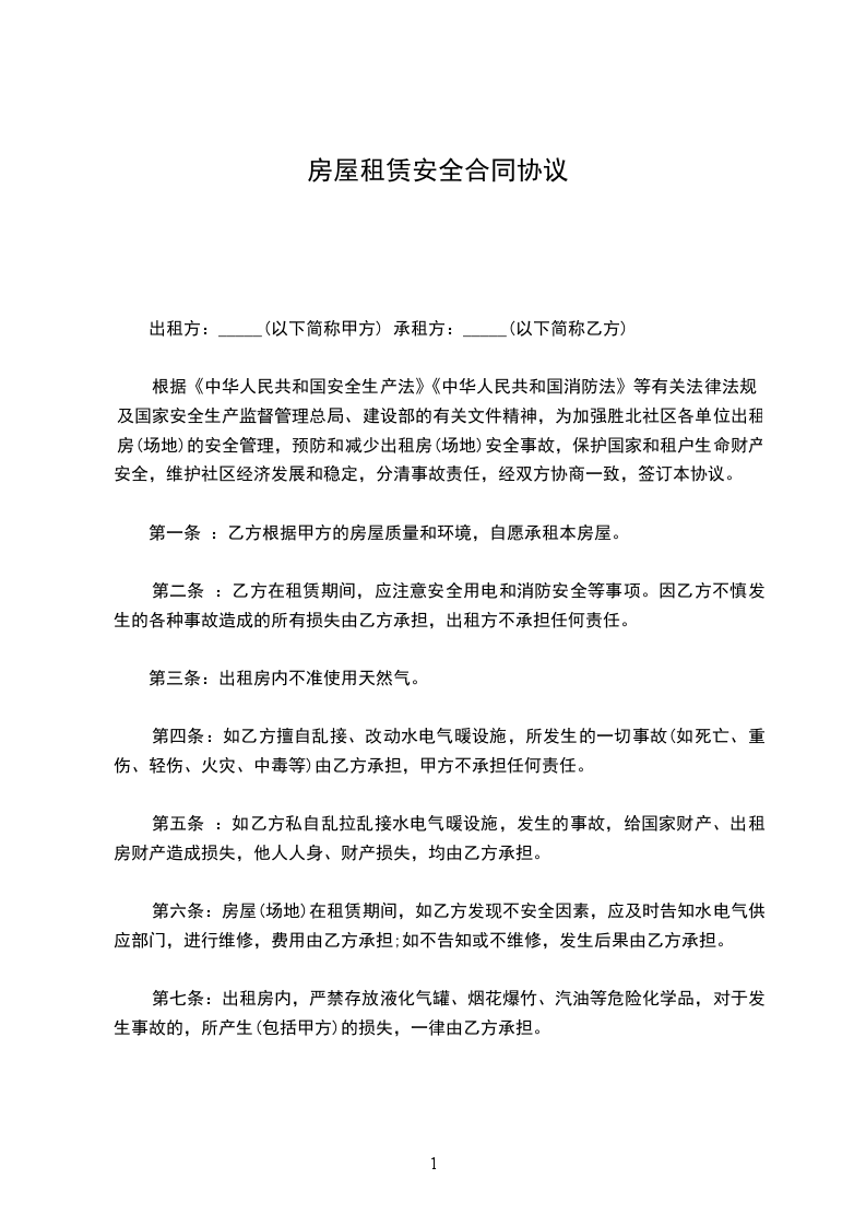 一、预防为主”的基本原则,加强安全监督管理,落实安全责任制,(甲方)与房屋承租户(乙方)签订安全责任书。
