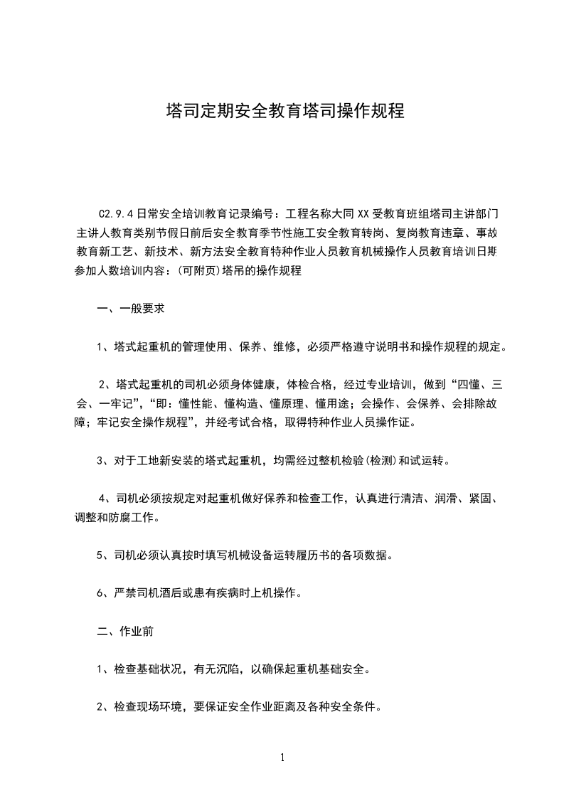 C2.9.4日常安全培训教育记录编号:工程名称大同XX受教育班组塔司主讲部门主讲人教育类别节假日前后安全教育季节性施工安全教育转岗、复岗教育违章、事故教育新工艺、新技术、新方法安全教育特种作业人员教育机械操作人员教育培训日期参加人数培训内容:(可附页)塔吊的操作规程