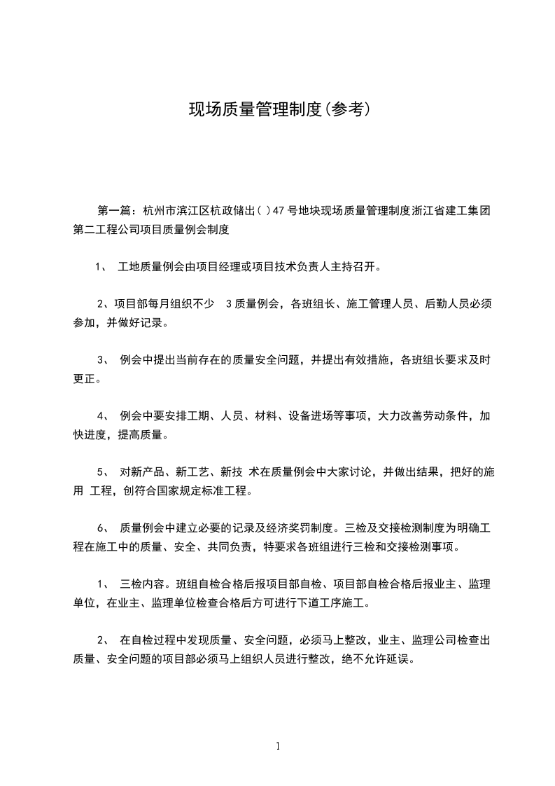 第一篇:杭州市滨江区杭政储出( )47号地块现场质量管理制度浙江省建工集团第二工程公司项目质量例会制度