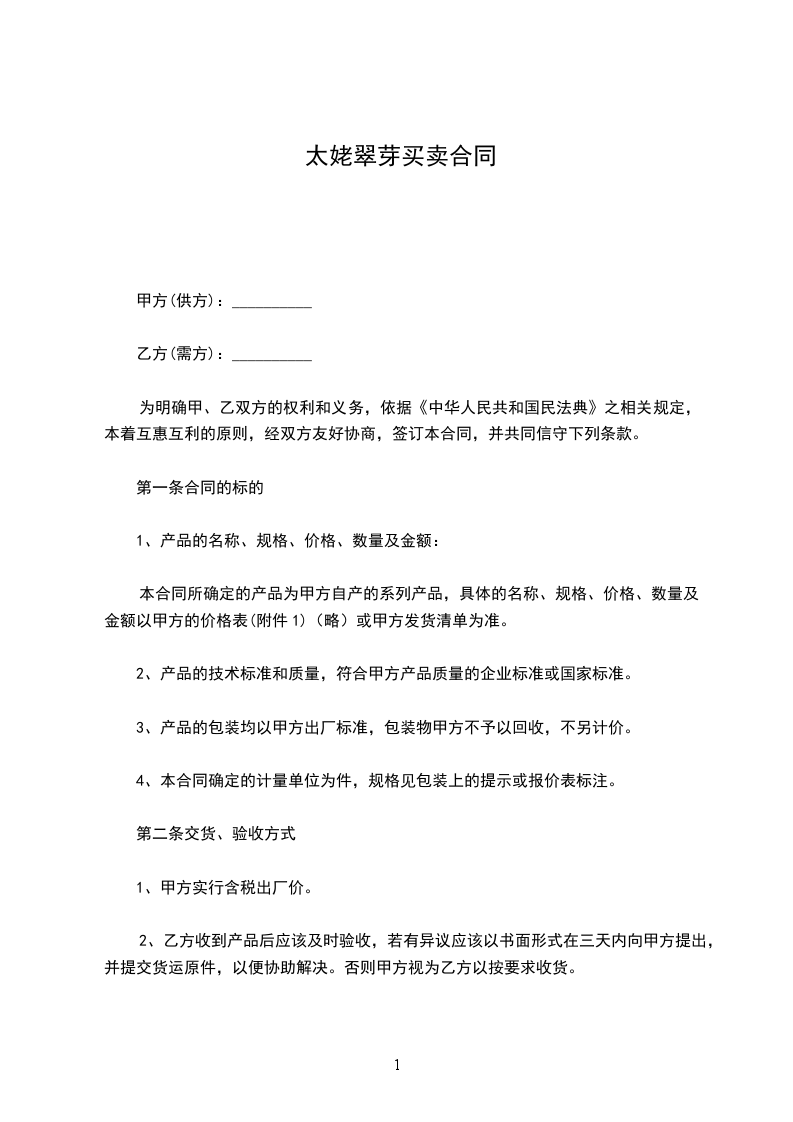 1、本合同所确定的产品为甲方生产的____________________________,具体的名称、规格、价格、数量及金额以甲方的价格表或甲方发货清单为准。