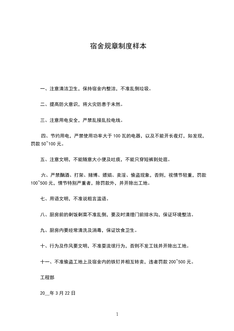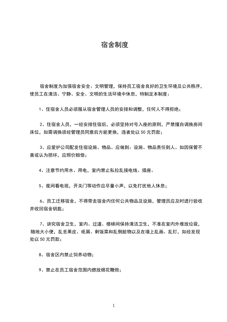 宿舍制度为加强宿舍安全、文明管理,保持员工宿舍良好的卫生环境及公共秩序,使员工在清洁、宁静、安全、文明的生活环境中休息,特制定本制度: