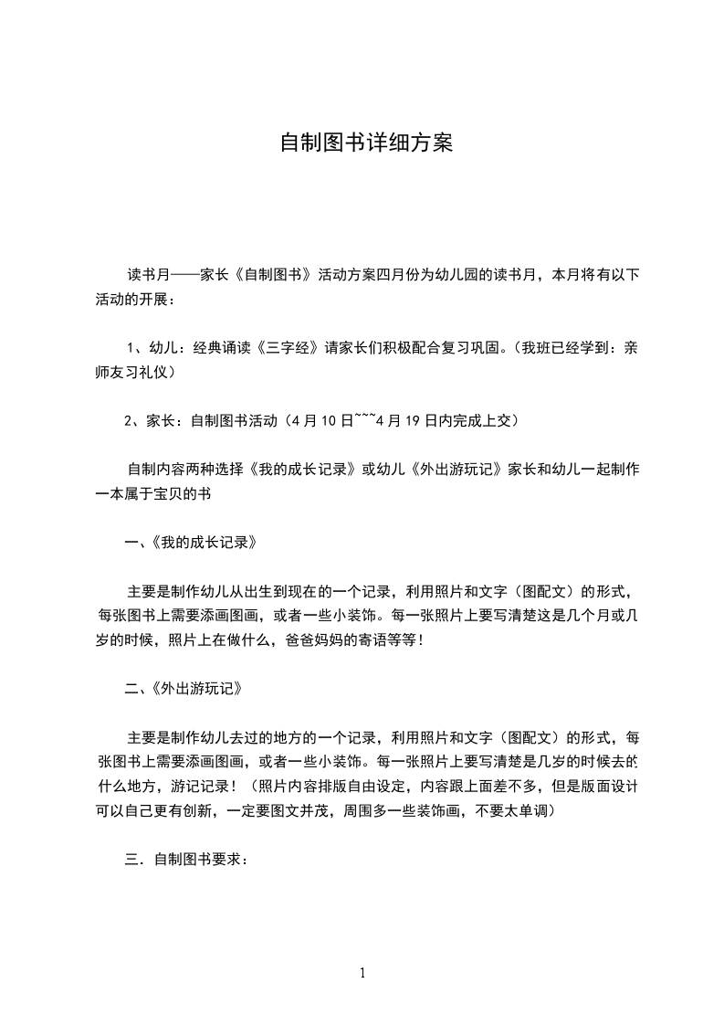 读书月——家长《自制图书》活动方案四月份为幼儿园的读书月,本月将有以下活动的开展:
