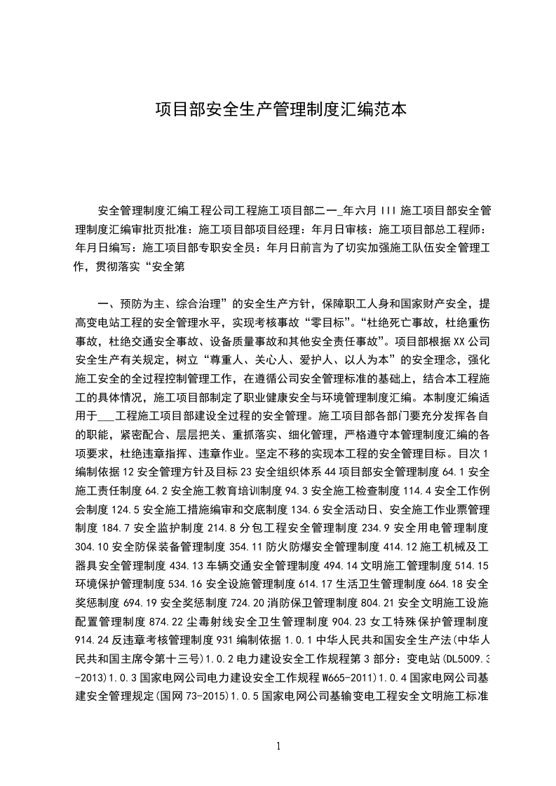 一、预防为主、综合治理”的安全生产方针,保障职工人身和国家财产安全,提高变电站工程的安全管理水平,实现考核事故“零目标”。“杜绝死亡事故,杜绝重伤事故,杜绝交通安全事故、设备质量事故和其他安全责任事故”。项目部根据XX公司安全生产有关规定,树立“尊重人、关心人、爱护人、以人为本”的安全理念,强化施工安全的全过程控制管理工作,在遵循公司安全管理标准的基础上,结合本工程施工的具体情况,施工项目部制定了职业健康安全与环境管理制度汇编。本制度汇编适用于___工程施工项目部建设全过程的安全管理。施工项目部各部门要充分发挥各自的职能,紧密配合、层层把关、重抓落实、细化管理,严格遵守本管理制度汇编的各项要求,杜绝违章指挥、违章作业。坚定不移的实现本工程的安全管理目标。目次1编制依据12安全管理方针及目标23安全组织体系44项目部安全管理制度64.1安全施工责任制度64.2安全施工教育培训制度94.3安全施工检查制度114.4安全工作例会制度124.5安全施工措施编审和交底制度134.6安全活动日、安全施工作业票管理制度184.7安全监护制度214.8分包工程安全管理制度234.9安全用电管理制度304.10安全防保装备管理制度354.11防火防爆安全管理制度414.12施工机械及工器具安全管理制度434.13车辆交通安全管理制度494.14文明施工管理制度514.15环境保护管理制度534.16安全设施管理制度614.17生活卫生管理制度664.18安全奖惩制度694.19安全奖惩制度724.20消防保卫管理制度804.21安全文明施工设施配置管理制度874.22尘毒射线安全卫生管理制度904.23女工特殊保护管理制度914.24反违章考核管理制度931编制依据1.0.1中华人民共和国安全生产法(中华人民共和国主席令第十三号)1.0.2电力建设安全工作规程第3部分:变电站(DL5009.3-2024)1.0.3国家电网公司电力建设安全工作规程W665-2024)1.0.4国家电网公司基建安全管理规定(国网73-2024)1.0.5国家电网公司基输变电工程安全文明施工标准化管理办法(国网87-2024)1.0.6关于利用数码照片资料加强输变电工程安全质量过程控制的通知(基建安全200725号)1.0.7国家电网公司输变电工程施工安全风险识别、评估及预控措施管理办法(国网76-2024)1.0.8国家电网公司施工项目部标准化管理手册(2024版)1.0.9施工现场临时用电安全技术规范(JGJ46-2005)1.0.10国家电网公司电力建设起重机械安全管理重点措施(试行)(基建XXX号)1.0.11国家电网公司应急预案编制规范(国家电网安监200798号)1.0.12国家电网公司安全工作奖惩规定(国家电网安监202441号)1.0.13国家电网公司输变电工程施工分包管理办法(国网81-2024)1.0.14国家电网公司关于印发进一步规范和加强施工分包管理工作指导意见的通知(国家电网基建201XXXX1185号)1.0.15国家电网公司输变电工程流动红旗竞赛管理办法(国网89-2024)1.0.16变电工程落地式钢管脚手架搭设安全技术规范W274-2009)1.0.17职业安全健康管理体系-规范(8001-2001)1.0.18环境管理体系-要求及使用指南(4001-2004)1.0.19建筑机械使用安全技术规程(JGJ33)1.0.20建筑施工高处作业安全技术规范(JGJ80)1.0.21国家电网公司安全事故调查规程(国家电网安监201XXXX2024号)2安全管理工作思路及目标2.0.1公司安全管理工作思路筑牢“以人为本、安全发展”理念,坚持“安全第