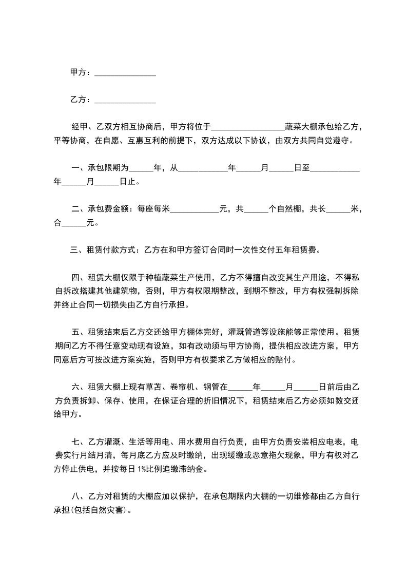 经甲、乙双方相互协商后,甲方将位于__________________蔬菜大棚承包给乙方,平等协商,在自愿、互惠互利的前提下,双方达成以下协议,由双方共同自觉遵守。