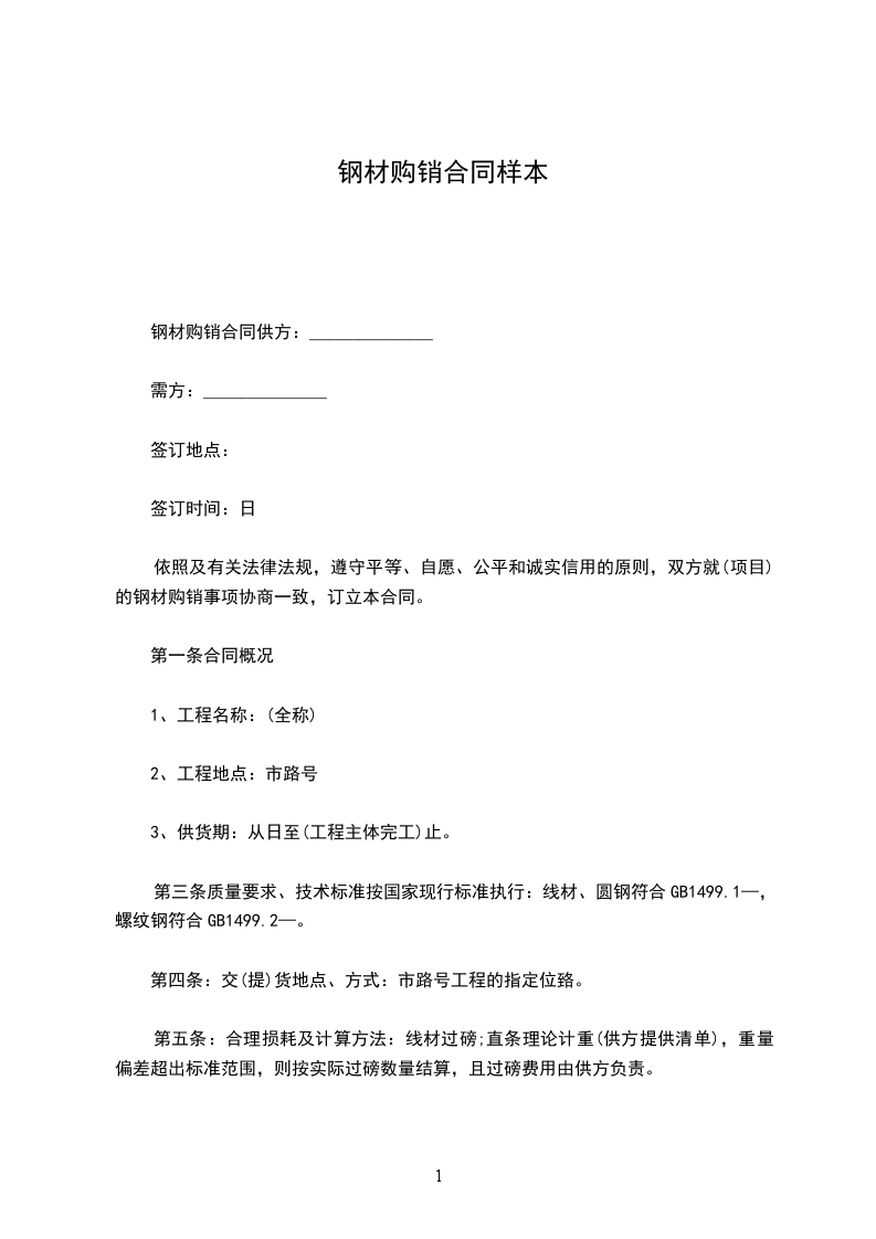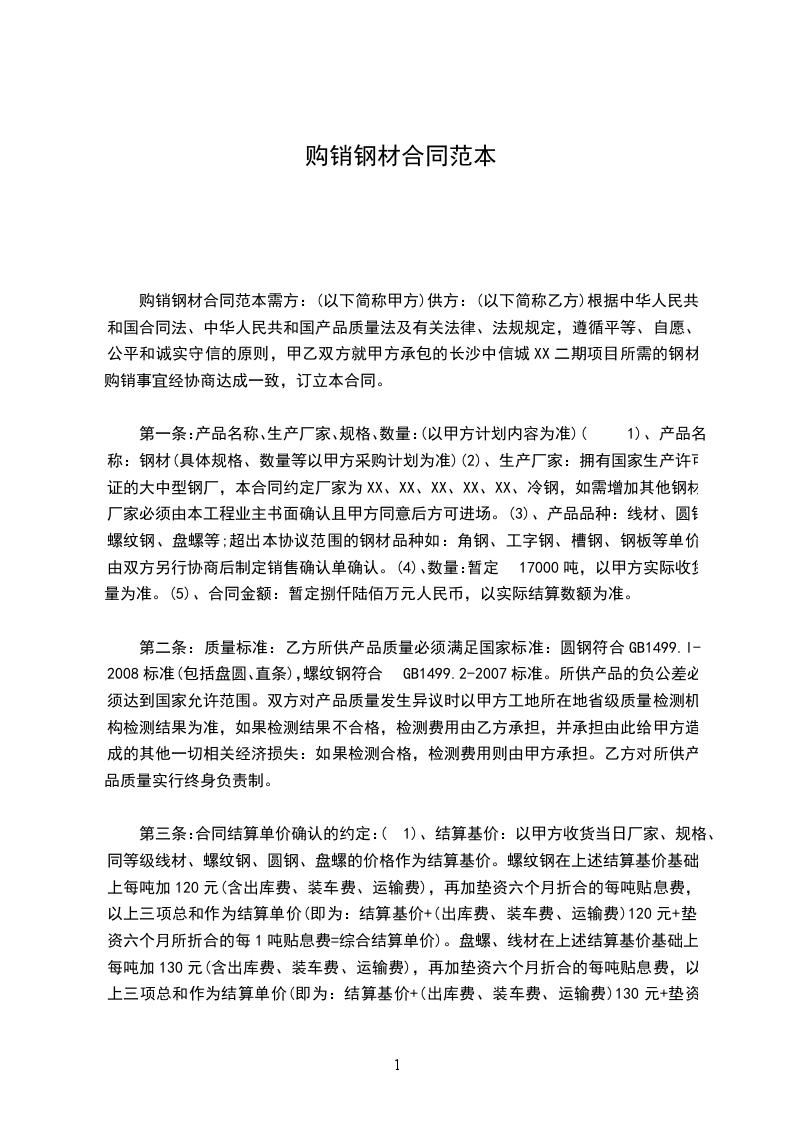 购销钢材合同范本需方:(以下简称甲方)供方:(以下简称乙方)根据中华人民共和国合同法、中华人民共和国产品质量法及有关法律、法规规定,遵循平等、自愿、公平和诚实守信的原则,甲乙双方就甲方承包的长沙中信城XX二期项目所需的钢材购销事宜经协商达成一致,订立本合同。