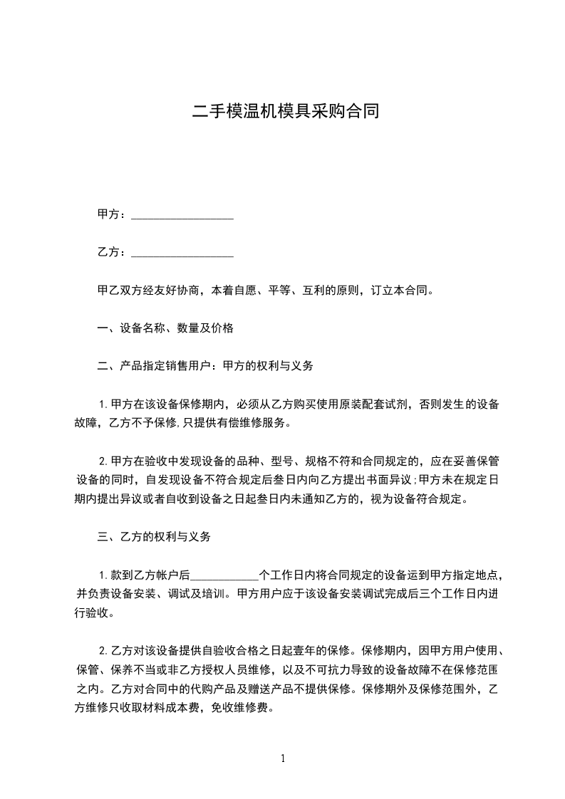 2.付款方式全部设备验收合格后的_______日内,甲方向乙方支付合同总金额的即元人民币整。若延期付款,甲方每天应向乙方缴纳延期额的千分之一作为罚金。合同总金额的余款即____________元人民币作为质保金,若设备运行正常,质保金在验收完成一年后的七日内一次性无息给付。