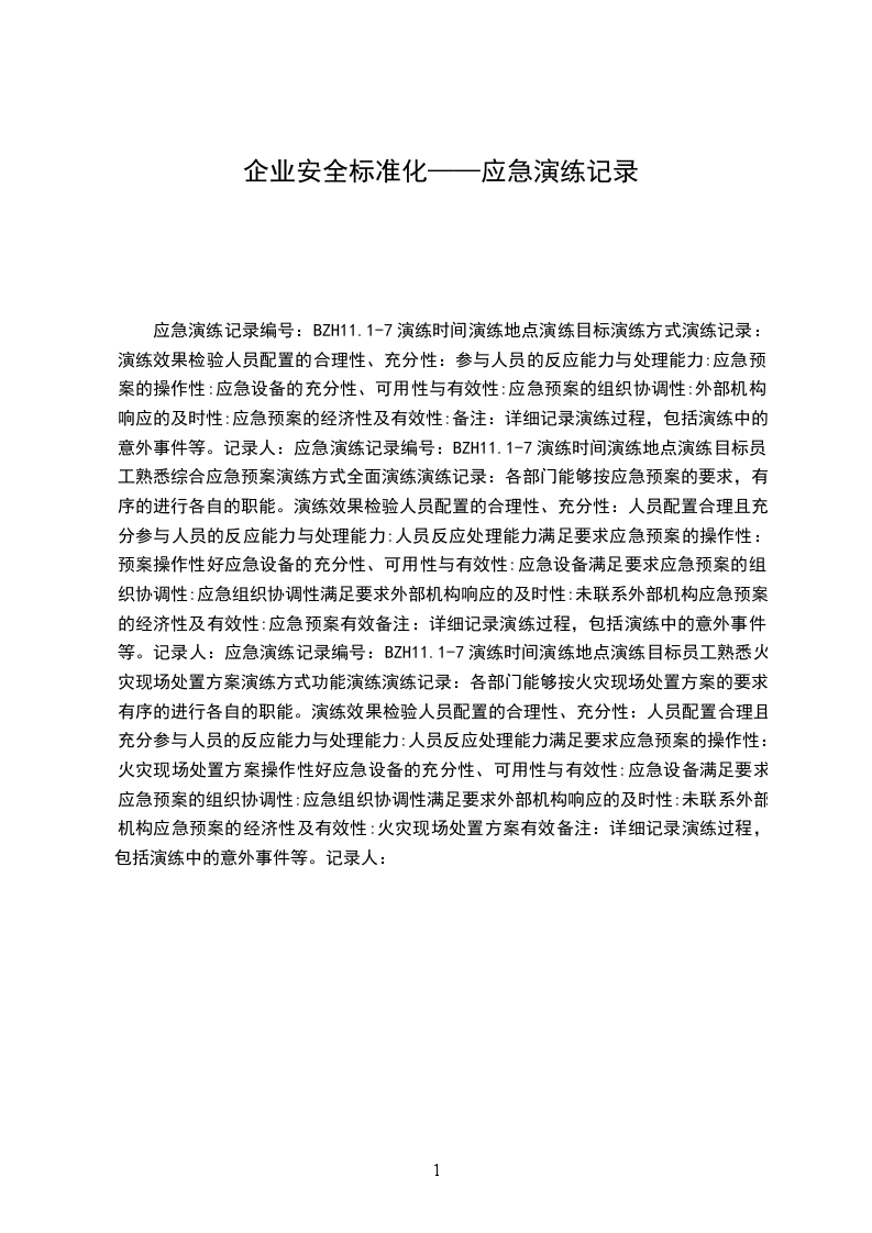 应急演练记录编号:BZH11.1-7演练时间演练地点演练目标演练方式演练记录:演练效果检验人员配置的合理性、充分性:参与人员的反应能力与处理能力:应急预案的操作性:应急设备的充分性、可用性与有效性:应急预案的组织协调性:外部机构响应的及时性:应急预案的经济性及有效性:备注:详细记录演练过程,包括演练中的意外事件等。记录人:应急演练记录编号:BZH11.1-7演练时间演练地点演练目标员工熟悉综合应急预案演练方式全面演练演练记录:各部门能够按应急预案的要求,有序的进行各自的职能。演练效果检验人员配置的合理性、充分性:人员配置合理且充分参与人员的反应能力与处理能力:人员反应处理能力满足要求应急预案的操作性:预案操作性好应急设备的充分性、可用性与有效性:应急设备满足要求应急预案的组织协调性:应急组织协调性满足要求外部机构响应的及时性:未联系外部机构应急预案的经济性及有效性:应急预案有效备注:详细记录演练过程,包括演练中的意外事件等。记录人:应急演练记录编号:BZH11.1-7演练时间演练地点演练目标员工熟悉火灾现场处置方案演练方式功能演练演练记录:各部门能够按火灾现场处置方案的要求,有序的进行各自的职能。演练效果检验人员配置的合理性、充分性:人员配置合理且充分参与人员的反应能力与处理能力:人员反应处理能力满足要求应急预案的操作性:火灾现场处置方案操作性好应急设备的充分性、可用性与有效性:应急设备满足要求应急预案的组织协调性:应急组织协调性满足要求外部机构响应的及时性:未联系外部机构应急预案的经济性及有效性:火灾现场处置方案有效备注:详细记录演练过程,包括演练中的意外事件等。记录人: