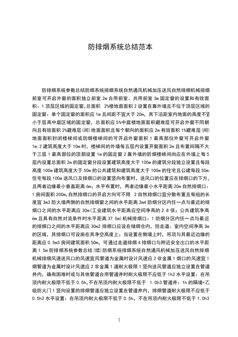 防排烟系统参数总结防烟系统排烟系统自然通风机械加压送风自然排烟机械排烟前室可开启外窗的面积独立前室2m合用前室、共用前室3m固定窗的设置和有效面积:1顶层区域的固定窗,总面积2%楼地面面积2设置在靠外墙且不位于顶层区域的固定窗:单个固定窗的面积应1m且间距不宜大于20m,其下沿距室内地面的高度不宜小于层高中庭区域的固定窗,总面积应5%中庭楼地面面积避难层可开启外窗不同朝向且有效面积2%避难层(间)地面面积且每个朝向的面积应2m有效面积1%避难层(间)地面面积封闭楼梯间或防烟楼梯间的可开启外窗面积1最高部位外窗可开启外窗1m;2建筑高度大于10m时,楼梯间的外墙每五层内设置开窗面积2m且布置间隔不大于三层1最高部位的顶部设置1m的固定窗2靠外墙的防烟楼梯间尚应在外墙上每5层内设置总面积2m的固定窗分段设置建筑高度大于100m的建筑分段独立设置且每段高度100m建筑高度大于50m的公共建筑和建筑高度大于100m的住宅且公建每段50m,住宅每段100m送风口及排烟口的设置竖向布置时,送风口的位置应在排烟口的下方,且两者边缘最小垂直距离6m;水平布置时,两者边缘最小水平距离20m自然排烟口:1房间面积200m,自然排烟口的开启方向可不限2自然排烟口宜分散布置且每组的长度宜3m3防火墙两侧的自然排烟窗之间的水平距离2m4防烟分区内任一点与最近的排烟口之间的水平距离应30m(工业建筑水平距离应空间净高的2.8倍;公共建筑净高6m且具有自然对流条件时水平距离37.5m)机械排烟口:1防烟分区内任一点与最近的排烟口之间的水平距离应30m2排烟口应设在储烟仓内,但走道、室内空间净高3m的区域,其排烟口可设施在其净空高度上;当设置在侧墙上时,吊顶与其最近边缘的距离应0.5m3房间建筑面积50m,可通过走道排烟4排烟口与附近安全出口的水平距离1.5m防排烟系统参数总结(续)防烟系统排烟系统自然通风机械加压送风自然排烟机械排烟风速送风口的风速宜风管道为金属时设计风速应2非金属1烟口的风速宜1烟管道为金属时设计风速应2非金属1道耐火极限1竖向送风管道应独立设置在管道井内,确有困难时或与其他管道合用管道井时耐火极限不应低于1h2水平设置:在吊顶内耐火极限不低于0.5h,不在吊顶内耐火极限不低于1.0h3管道井:1h的隔墙+乙级防火门1竖向设置的排烟管道应独立设置在管道井内,排烟管道耐火极限不应低于0.5h2水平设置:在吊顶内耐火极限不低于0.5h,不在吊顶内耐火极限不低于1.0h3设置在走道部位吊顶内以及穿越防火分区的排烟管道耐火极限不低于1.0h(设备用房和汽车库耐火极限可不低于0.5h)送风量1设计风量不应小于计算风量的1.2倍2封闭避难层(间)、避难走道:净面积3避难走道前室:直接开向前室的疏散门的总断面积前室、封闭避难层(间)与走道之间的压差应为25Pa30Pa楼梯间与走道之间的压差应为40Pa50Pa设计风量不应小于计算风量的1.2倍除中庭外一个防烟分区的排烟机计算应符合下列规定,且单台风机的排烟量不小于720建筑空间6m的场所,其排烟量应6.m)且取值1500或设置有效面积房间建筑面积2%的自然排烟窗(口)2当公共建筑仅需在走道或回廊设置排烟时,其排烟量不应小于1300或在走道两端(侧)均设置面积2m的自然排烟窗(口)且两侧自然排烟窗(口)的距离不应小于走道长度公共建筑内房间内与走道或回廊均需设置排烟时,其走道或回廊的机械排烟量可按6.m),且不小于1300风系统1设置场所:除地上建筑的走道或建筑面积小于500m的房间外,设置排烟系统的场所应设置补风系统2补风量:直接从室外引入空气,且补风量不应小于排烟量的50%3设置位置:补风口与排烟口设置在同一空间内相邻的防火分区时,补风口位置不限;当补风口与排烟口设置在同一防烟分区时,补风口应设在储烟仓下沿以下;补风口与排烟口水平距离不应小于5m4风速:机械补风口的风速宜1人员密集场所补风口的风速宜自然补风口的风速宜耐火极限:补风管道耐火极限应0.5h,当补风管道跨越防火分区时,管道的耐火极限1.5h6启闭:补风系统应与排烟系统联动开启或关闭