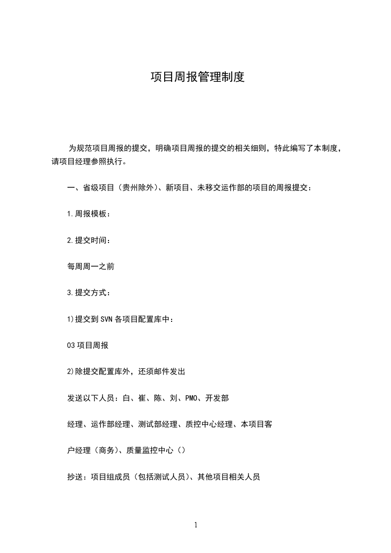 为规范项目周报的提交,明确项目周报的提交的相关细则,特此编写了本制度,请项目经理参照执行。