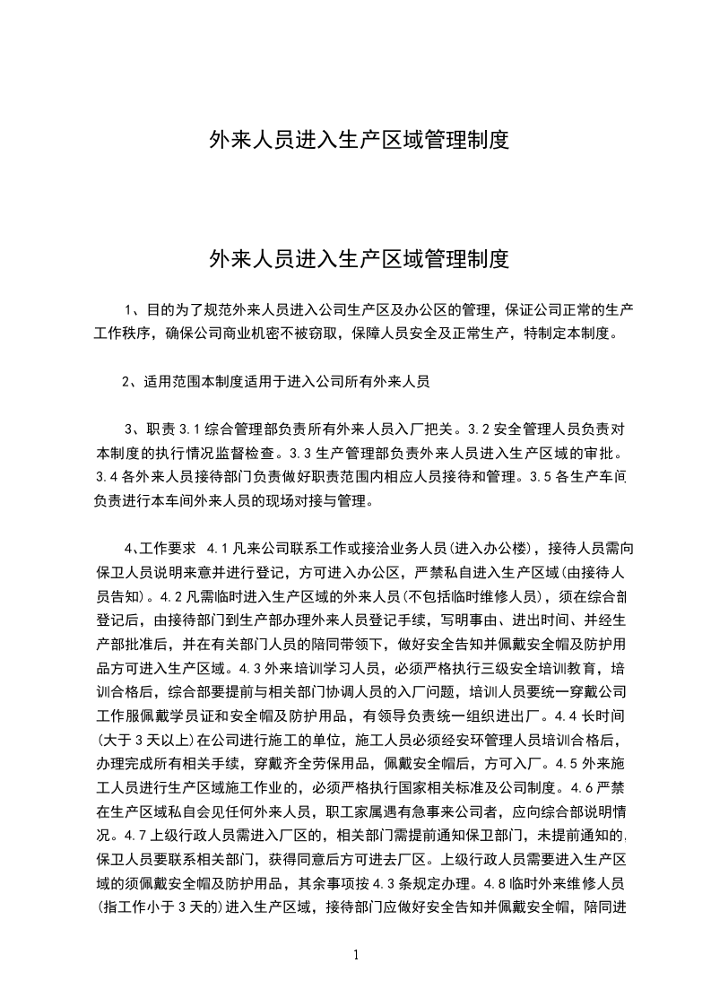 4、工作要求4.1凡来公司联系工作或接洽业务人员(进入办公楼),接待人员需向保卫人员说明来意并进行登记,方可进入办公区,严禁私自进入生产区域(由接待人员告知)。4.2凡需临时进入生产区域的外来人员(不包括临时维修人员),须在综合部登记后,由接待部门到生产部办理外来人员登记手续,写明事由、进出时间、并经生产部批准后,并在有关部门人员的陪同带领下,做好安全告知并佩戴安全帽及防护用品方可进入生产区域。4.3外来培训学习人员,必须严格执行三级安全培训教育,培训合格后,综合部要提前与相关部门协调人员的入厂问题,培训人员要统一穿戴公司工作服佩戴学员证和安全帽及防护用品,有领导负责统一组织进出厂。4.4长时间(大于3天以上)在公司进行施工的单位,施工人员必须经安环管理人员培训合格后,办理完成所有相关手续,穿戴齐全劳保用品,佩戴安全帽后,方可入厂。4.5外来施工人员进行生产区域施工作业的,必须严格执行国家相关标准及公司制度。4.6严禁在生产区域私自会见任何外来人员,职工家属遇有急事来公司者,应向综合部说明情况。4.7上级行政人员需进入厂区的,相关部门需提前通知保卫部门,未提前通知的,保卫人员要联系相关部门,获得同意后方可进去厂区。上级行政人员需要进入生产区域的须佩戴安全帽及防护用品,其余事项按4.3条规定办理。4.8临时外来维修人员(指工作小于3天的)进入生产区域,接待部门应做好安全告知并佩戴安全帽,陪同进入维修现场,陪同人员须全程在维修现场,待维修结束后,再随维修人员出厂。外来维修人员只能在维修工作范围内活动,禁止在车间内随意走动。4.9不接受门卫人员的检查、登记,无理取闹,擅自闯入,妨碍保卫人员正常工作者,由综合部根据情况酌情处理,情节严重者,交由公安机关处理。4.10外来装货或送货车辆,须经综合部办理厂区机动车通行证后,在接待部门人员带领下方可进入厂区,并将车辆按顺序停放在公司指定区域,司机在厂区内不得随意走动。4.11外来上级主管部门或业务单位需到公司参观的,由对口接待部门及时通知综合部,由接待部门做好入厂前安全告知,然后在接待人员陪同下按既定路线参观。参观人员需要进入生产区域的要佩戴安全帽及防护用品,其余事项按第4.3条规定办理。4.12进入生产区域的所有外来人员未经允许不能进行拍照及摄像,如因设备质量问题需要拍照的,须经设备管理部门主要负责人和设备所属部门的主要负责人同意后方可拍照。4.13生产区域的工作人员严禁将本岗位的原始记录、技术资料交于外来人员观看、摘抄、复印或带走,严禁与外来人员交流公司的专利技术。4.14进入生产区域的所有人员需根据岗位特点佩戴劳动防护用品;进入生产区域的重要岗位或特殊区域时进行登记,岗位人员需全程陪同监护。4.15生产区域的部门及岗位工作人员必须严格遵守以上规定,对进入生产区域的外来人员有权询问、检查,对不按规定进入生产区域的外来人员,岗位班长有权劝阻进入或驱逐出本区域,并通知相关部门。5考核5.1接待部门未按本规定进行登记,直接将外来人员带入生产区域的,对负责人罚款500元;进入重要岗位或特殊区域的,对负责人处罚款1000元。5.2对不按规定穿戴劳保用品的外来人员,每人次罚款100元。5.3由于对进入生产区域的外来人员未进行安全告知或防护用品不到位而引发的各种伤害事故,由对口接待部门承担直接责任,并对接待部门负责人给予罚款1000元,有关责任人按1000元以上标准处罚。5.4生产区域所属单位的工作人员对外来人员的进入不予管理、制止或未及时上报的,对负责人处以罚款200元;对进入重要岗位或特殊区域的人员不按规定要求其登记的,对负责人处以罚款500元。5.5生产区域的工作人员私自泄露公司相关生产数据和技术资料等公司机密的,对责任人处以罚款2000元,情节严重的将加倍罚款。5.6外来人员不按规定私自进入生产区域的,罚款200元;不听从劝阻、不服从工作人员引导的,罚款500元,并通知保卫部门予以驱逐出厂。5.7外来人员的其它违规违纪现象,对相关部门负责人处以罚款500元。6附则6.1本规定将根据实际执行情况由生产部负责进行修订。6.2文件记录:6.2.1重要岗位及特殊区域名录:高X熔融车间、高X洗涤车间、高X可膨胀车间、酸库、球形提纯车间、废酸提纯车间、石墨烯车间、石墨化车间。6.2.2重要岗位及特殊区域登记表见下表16.2.3进入生产区域申请表见下表2