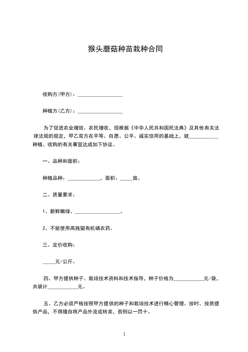 五、乙方必须严格按照甲方提供的种子和栽培技术进行精心管理。按时、按质提供产品,不得擅自将产品外流或转卖,否则以一罚十。