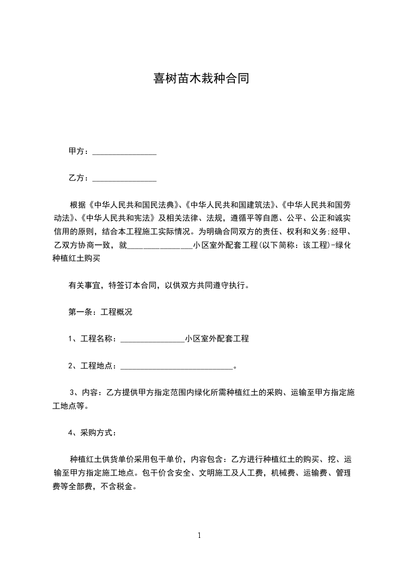 根据《中华人民共和国民法典》、《中华人民共和国建筑法》、《中华人民共和国劳动法》、《中华人民共和宪法》及相关法律、法规,遵循平等自愿、公平、公正和诚实信用的原则,结合本工程施工实际情况。为明确合同双方的责任、权利和义务;经甲、乙双方协商一致,就________________小区室外配套工程(以下简称:该工程)-绿化种植红土购买