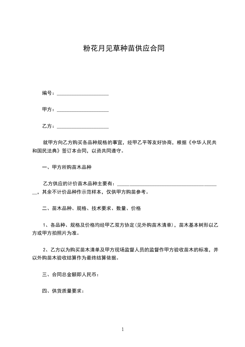 根据《中华人民共和国民法典》和国家或地方相关法律、法规及规范要求,经甲乙双方协商,就乙方按甲方要求提供甲方________________苗木事宜达成一致。为明确双方权利与义务,特签订如下协议条款,供双方共同遵守。