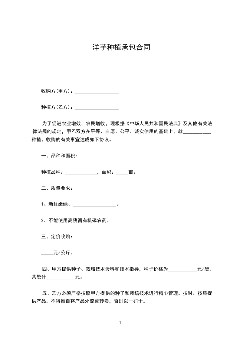为了促进农业增效、农民增收,现根据《中华人民共和国民法典》及其他有关法律法规的规定,甲乙双方在平等、自愿、公平、诚实信用的基础上,就____________种植、收购的有关事宜达成如下协议。