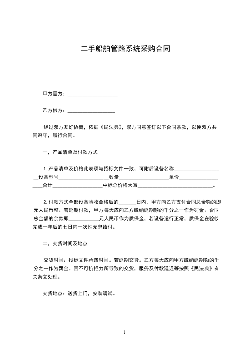 2.付款方式全部设备验收合格后的_______日内,甲方向乙方支付合同总金额的即元人民币整。若延期付款,甲方每天应向乙方缴纳延期额的千分之一作为罚金。合同总金额的余款即____________元人民币作为质保金,若设备运行正常,质保金在验收完成一年后的七日内一次性无息给付。