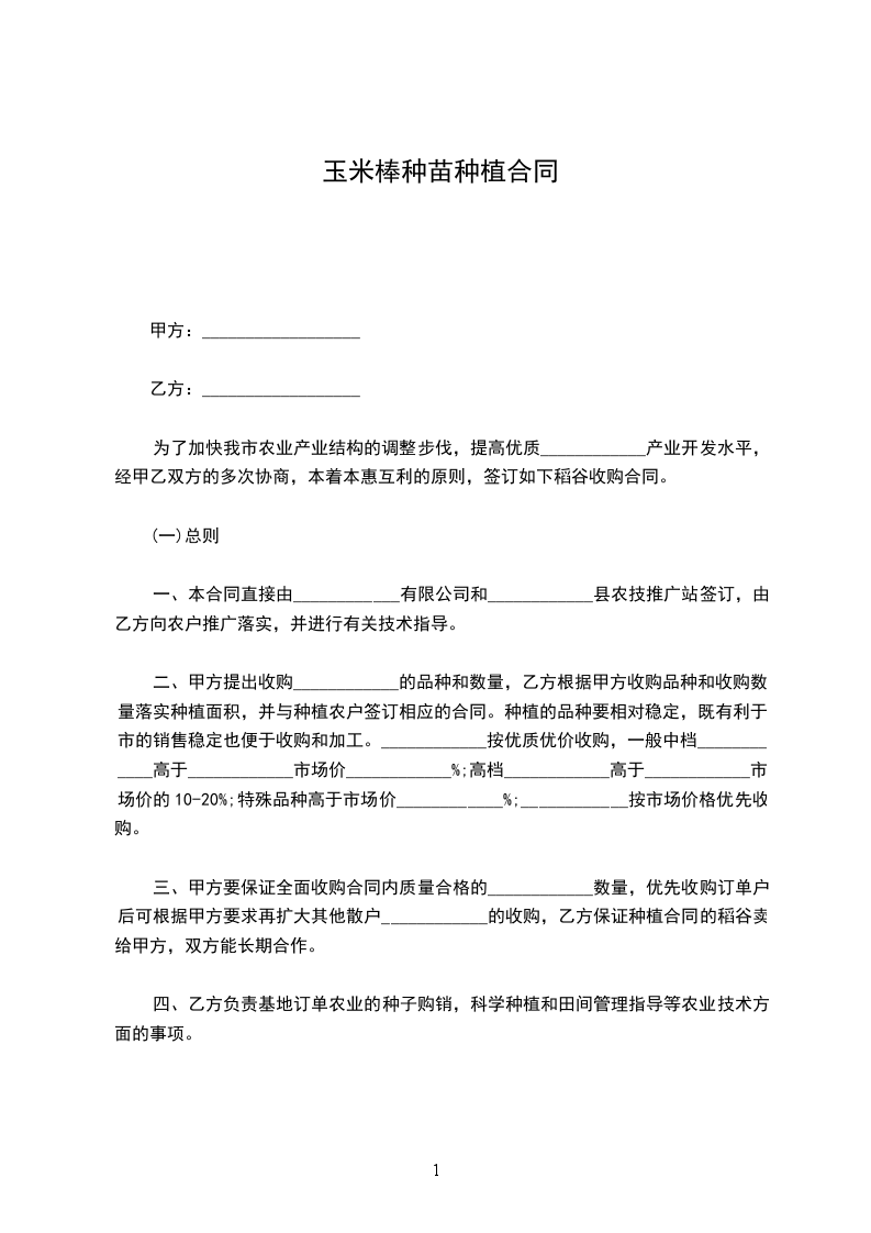 二、甲方提出收购____________的品种和数量,乙方根据甲方收购品种和收购数量落实种植面积,并与种植农户签订相应的合同。种植的品种要相对稳定,既有利于市的销售稳定也便于收购和加工。____________按优质优价收购,一般中档____________高于____________市场价____________%;高档____________高于____________市场价的10-20%;特殊品种高于市场价____________%;____________按市场价格优先收购。