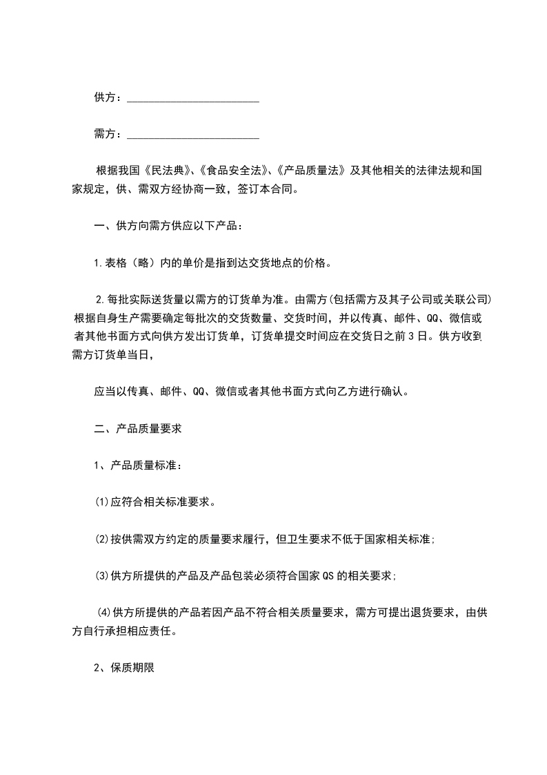 1、甲方有向乙方供给质量合格产品的义务。