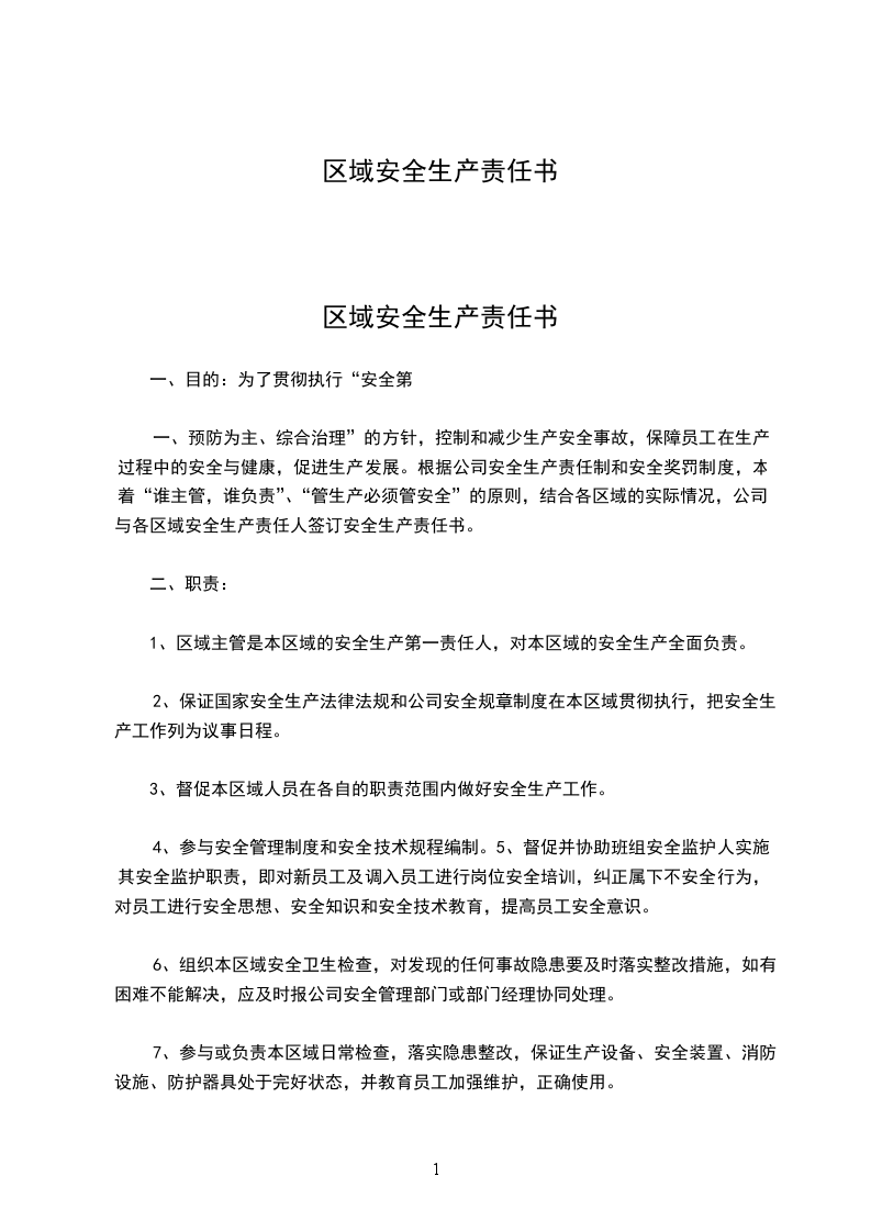 一、预防为主、综合治理”的方针,控制和减少生产安全事故,保障员工在生产过程中的安全与健康,促进生产发展。根据公司安全生产责任制和安全奖罚制度,本着“谁主管,谁负责”、“管生产必须管安全”的原则,结合各区域的实际情况,公司与各区域安全生产责任人签订安全生产责任书。