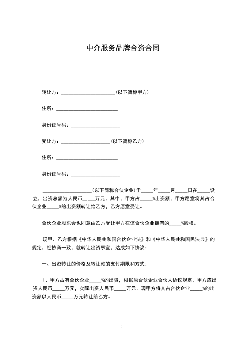 1、甲方占有合伙企业_____%的出资,根据原合伙企业合伙人协议规定,甲方应出资人民币_____万元,实际出资人民币_____万元。现甲方将其占合伙企业_____%的出资额以人民币_____万元转让给乙方。
