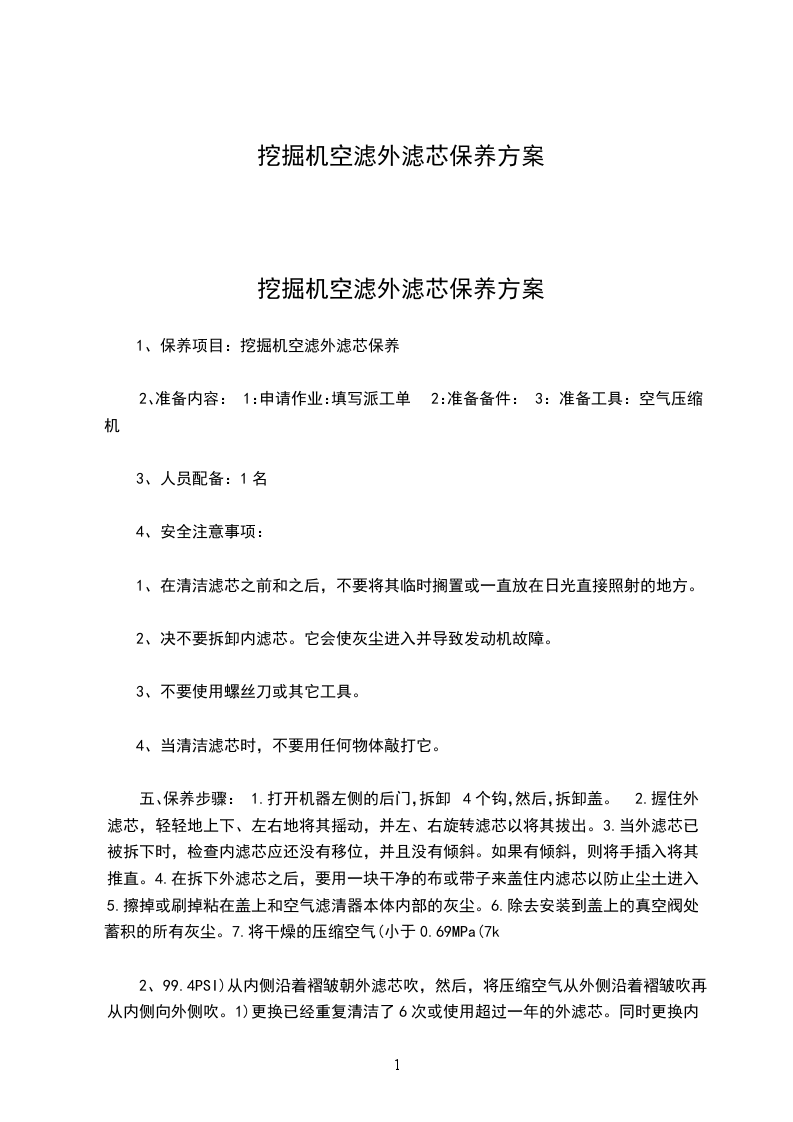 挖掘机空滤外滤芯保养方案