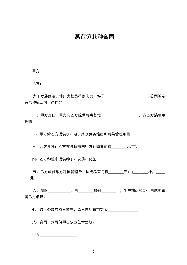 甲方将位于_________的土地共计__亩,地宽___米,发包给乙方生产经营,用于发展农作物种植。承包期为_________年,从_________年______月___日起至_________年______月___日止。