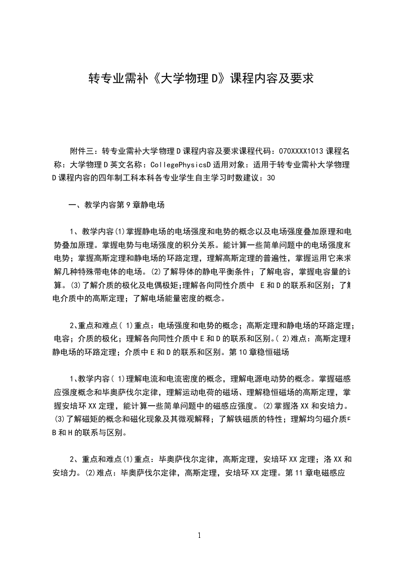 附件三:转专业需补大学物理D课程内容及要求课程代码:070XXXX1013课程名称:大学物理D英文名称:CollegePhysicsD适用对象:适用于转专业需补大学物理D课程内容的四年制工科本科各专业学生自主学习时数建议:30