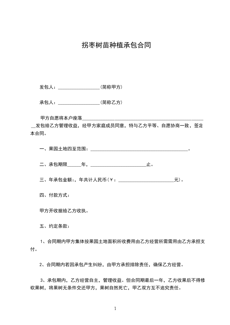 3、承包期内,乙方经营自主,管理收益。但合同期最后一年,乙方收果后不得修砍果树,将果树无条件交还甲方,果树自然死亡,甲乙双方互不追究责任。