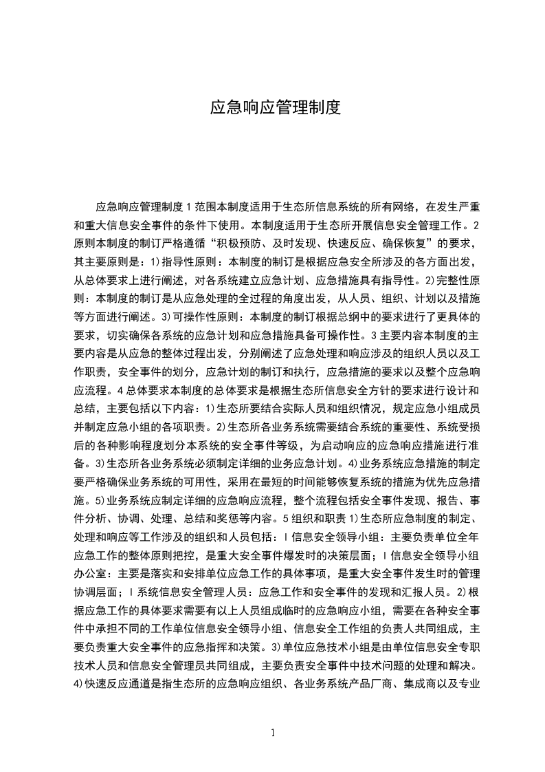 应急响应管理制度1范围本制度适用于生态所信息系统的所有网络,在发生严重和重大信息安全事件的条件下使用。本制度适用于生态所开展信息安全管理工作。2原则本制度的制订严格遵循“积极预防、及时发现、快速反应、确保恢复”的要求,其主要原则是:1)指导性原则:本制度的制订是根据应急安全所涉及的各方面出发,从总体要求上进行阐述,对各系统建立应急计划、应急措施具有指导性。2)完整性原则:本制度的制订是从应急处理的全过程的角度出发,从人员、组织、计划以及措施等方面进行阐述。3)可操作性原则:本制度的制订根据总纲中的要求进行了更具体的要求,切实确保各系统的应急计划和应急措施具备可操作性。3主要内容本制度的主要内容是从应急的整体过程出发,分别阐述了应急处理和响应涉及的组织人员以及工作职责,安全事件的划分,应急计划的制订和执行,应急措施的要求以及整个应急响应流程。4总体要求本制度的总体要求是根据生态所信息安全方针的要求进行设计和总结,主要包括以下内容:1)生态所要结合实际人员和组织情况,规定应急小组成员,并制定应急小组的各项职责。2)生态所各业务系统需要结合系统的重要性、系统受损后的各种影响程度划分本系统的安全事件等级,为启动响应的应急响应措施进行准备。3)生态所各业务系统必须制定详细的业务应急计划。4)业务系统应急措施的制定要严格确保业务系统的可用性,采用在最短的时间能够恢复系统的措施为优先应急措施。5)业务系统应制定详细的应急响应流程,整个流程包括安全事件发现、报告、事件分析、协调、处理、总结和奖惩等内容。5组织和职责1)生态所应急制度的制定、处理和响应等工作涉及的组织和人员包括:l信息安全领导小组:主要负责单位全年应急工作的整体原则把控,是重大安全事件爆发时的决策层面;l信息安全领导小组办公室:主要是落实和安排单位应急工作的具体事项,是重大安全事件发生时的管理协调层面;l系统信息安全管理人员:应急工作和安全事件的发现和汇报人员。2)根据应急工作的具体要求需要有以上人员组成临时的应急响应小组,需要在各种安全事件中承担不同的工作单位信息安全领导小组、信息安全工作组的负责人共同组成,主要负责重大安全事件的应急指挥和决策。3)单位应急技术小组是由单位信息安全专职技术人员和信息安全管理员共同组成,主要负责安全事件中技术问题的处理和解决。4)快速反应通道是指生态所的应急响应组织、各业务系统产品厂商、集成商以及专业的安全厂商,主要负责具体设备、系统以及安全问题的处理和解决。6安全事件根据生态所安全故障中的规定和要求,本应急规范从安全事件给业务系统和网络所带来的安全风险出发,分析对业务系统造成的损害等因素,划分不同的安全事件等级。这些因素具体包括以下内容:l人员的生命安全;l业务可用性;l保护敏感信息;l保护网络与信息资产,使遭受的损失降至最小;l业务关键程度;l允许中断时间。通过对于以上因素的分析,可以把生态所的安全事件分为以下三级:重大安全事件:由于信息安全问题对关键业务造成直接影响,并导致全网瘫痪、业务中断数小时以上的事件,称为重大安全事件;严重安全事件:由于信息安全问题对重要业务造成直接影响,并导致网络与业务中断,称为严重安全事件。一般安全事件:由于信息安全问题对重要业务造成间接影响,一般业务造成直接影响,并导致网络与业务遭受严重影响的事件,称为一般安全事件。7应急计划7.1应急计划的制定123XXXX5677.17.1.1制定原则l完整性原则:应急计划的制定必须完整,要覆盖应急处理的全方位与全过程,并涵盖实施应急的全部业务品种及相关机构、人员。l关键业务优先原则:在分析业务的优先等级、风险危害程度的基础上,优先保证重要业务应用的持续运作。l可操作性原则:应急措施必须明确、具体、切实、XX,操作对象与步骤必须有准确、详细的描述。l经济与时效性原则:应急措施的选用要考虑成本与时效,必须把有限的资源用于关键业务的核心环节。充分考虑业务系统的时效性影响。l可恢复性原则:应急计划中确定的各项处理措施必须为应急后的系统恢复提供必需的数据与资料,符合系统恢复所必须的基本处理逻辑,以便对业务系统进行有效恢复,保证系统恢复后的正常运行。l责任明确原则:应急计划要明确各级领导、各业务部门、监管部门、技术部门及其他各部门所属人员的职责,以保证计划实施过程中责任的落实,并最大限度地降低风险。l可稽核性原则:有明确的实现标志和检查标准,使应急计划能够接受检查与验证。l适应性原则:应急计划应根据各系统的变化和业务的变化进行适时修订。7.1.2制定组织各业务系统应急计划的制定必须由信息安全领导小组办公室的信息安全专业技术人员和系统安全管理员共同制定。7.2应急计划的主要内容在保证应急计划能够完整有效的执行并对安全事件的应急恢复有直接的指导和操作内容,各系统的应急计划的主要内容至少包括应急响应组织和人员、各业务系统安全事件的具体定义、应急响应措施、应急响应流程等详细内容。分别要求如下:1)应急响应组织各业务系统的应急响应组织应根据本规范中组织和职责的规定详细定义各系统的组织成员和职责,至少