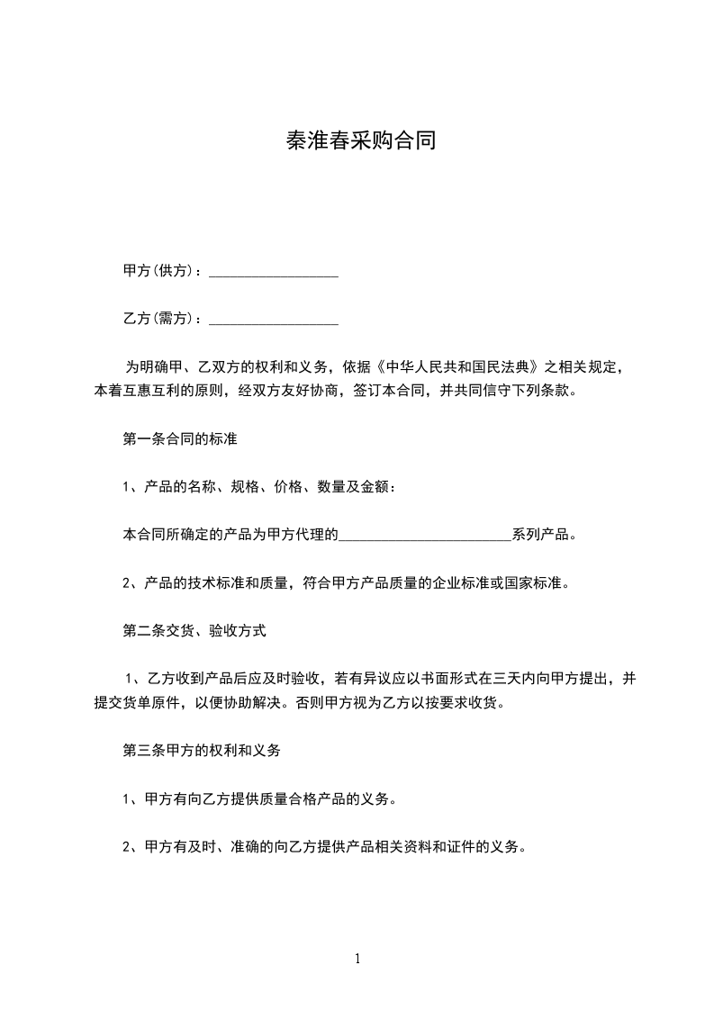 1、甲方有向乙方供给质量合格产品的义务。