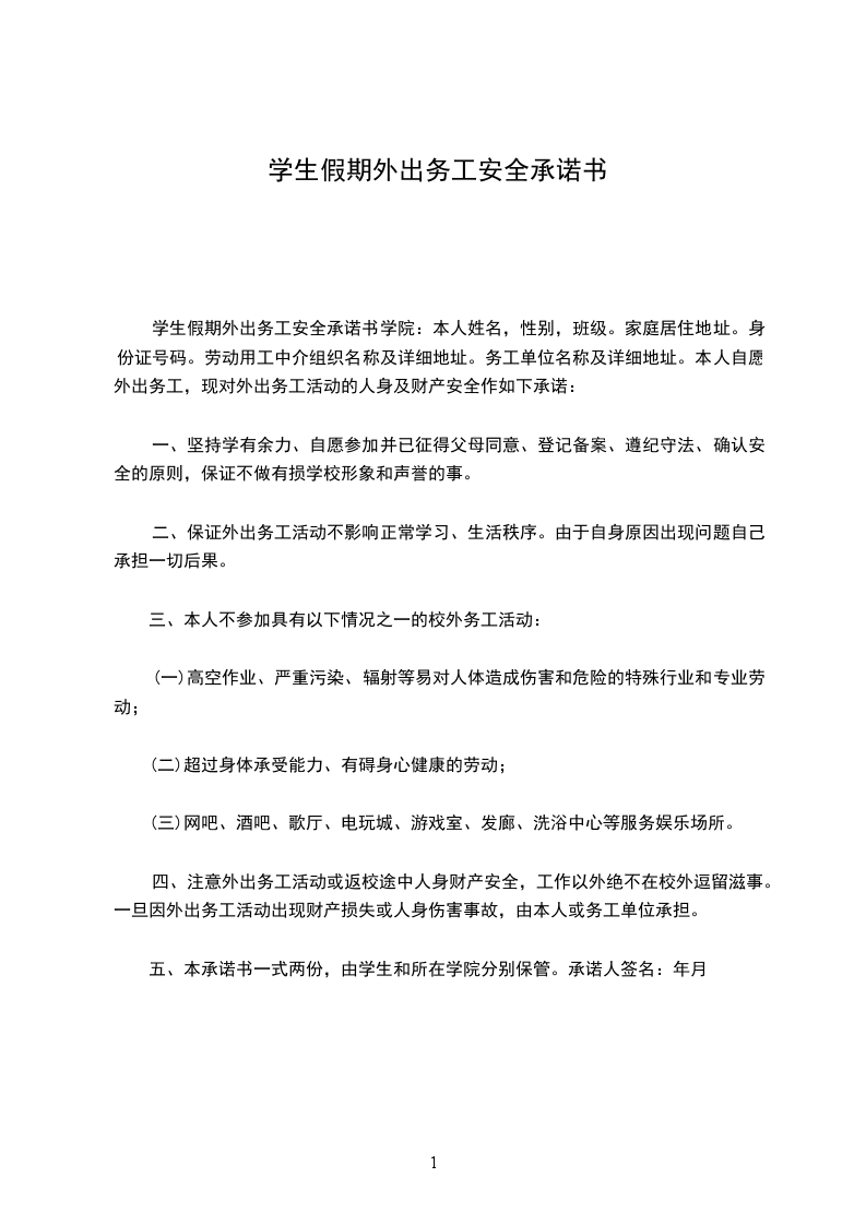 学生假期外出务工安全承诺书学院:本人姓名,性别,班级。家庭居住地址。身份证号码。劳动用工中介组织名称及详细地址。务工单位名称及详细地址。本人自愿外出务工,现对外出务工活动的人身及财产安全作如下承诺: