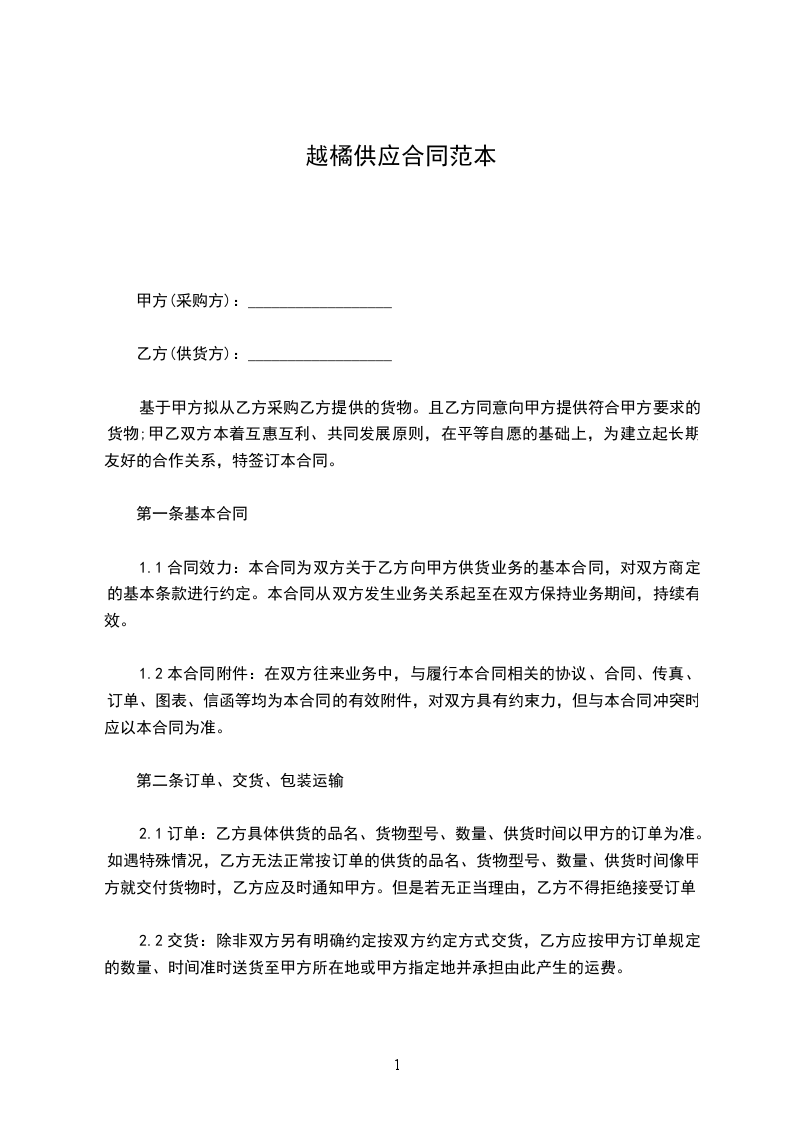1.1合同效力:本合同为双方关于乙方向甲方供货业务的基本合同,对双方商定的基本条款进行约定。本合同从双方发生业务关系起至在双方保持业务期间,持续有效。