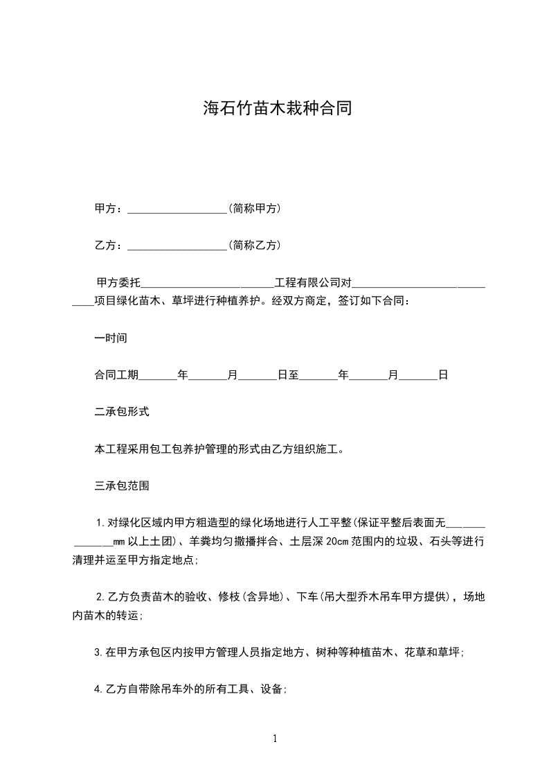 经甲方同意将位于______________________________树木种植工作交由乙方承包。为明确双方的权利、义务和责任,现经双方友好协商,达成以下条款: