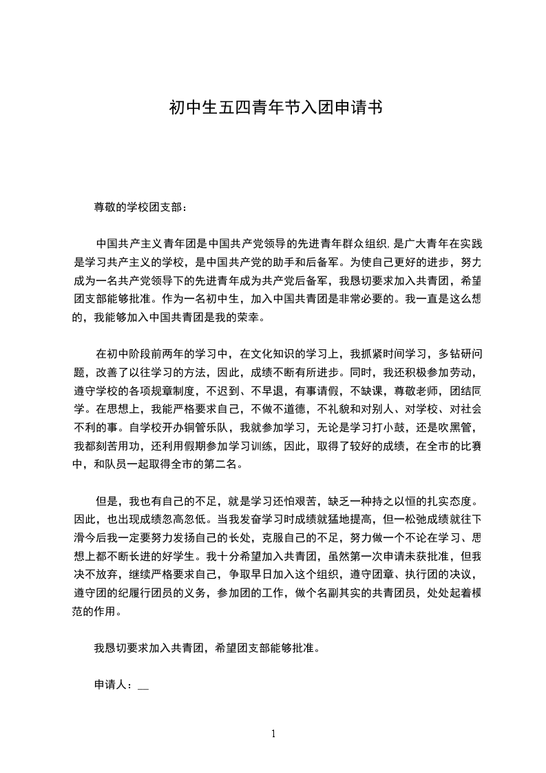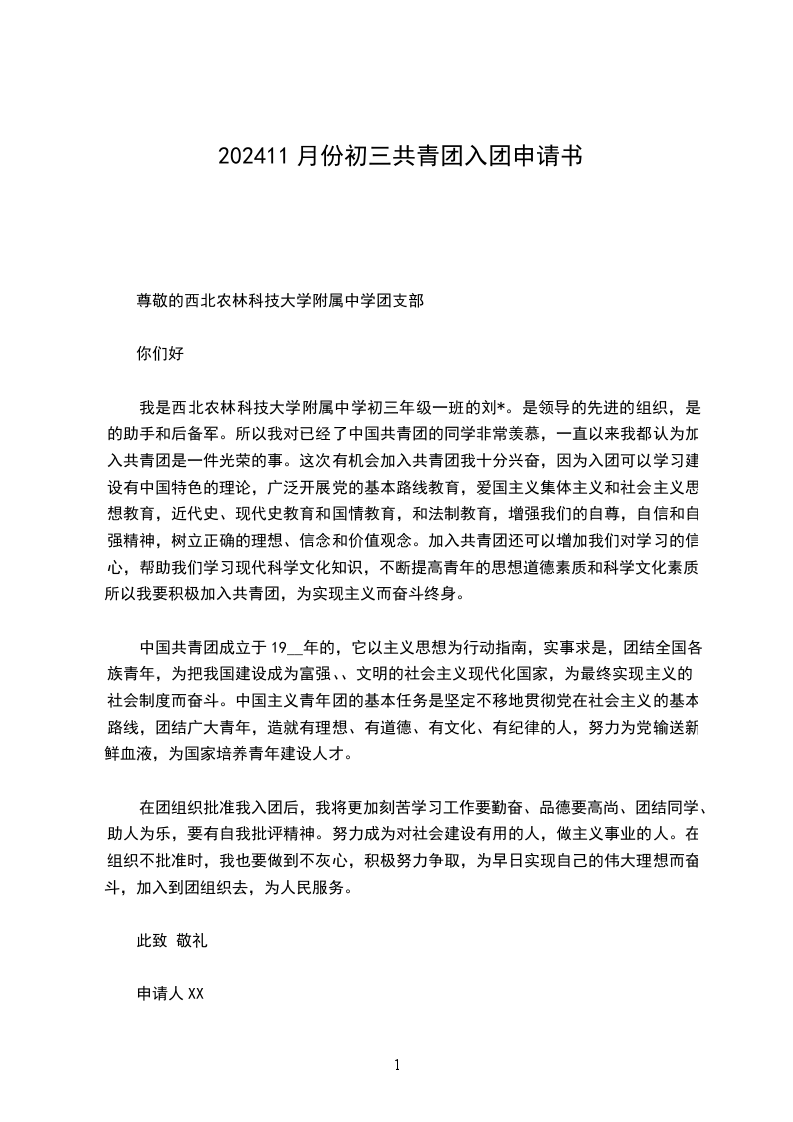 我是西北农林科技大学附属中学初三年级一班的刘*。是领导的先进的组织,是的助手和后备军。所以我对已经了中国共青团的同学非常羡慕,一直以来我都认为加入共青团是一件光荣的事。这次有机会加入共青团我十分兴奋,因为入团可以学习建设有中国特色的理论,广泛开展党的基本路线教育,爱国主义集体主义和社会主义思想教育,近代史、现代史教育和国情教育,和法制教育,增强我们的自尊,自信和自强精神,树立正确的理想、信念和价值观念。加入共青团还可以增加我们对学习的信心,帮助我们学习现代科学文化知识,不断提高青年的思想道德素质和科学文化素质。所以我要积极加入共青团,为实现主义而奋斗终身。