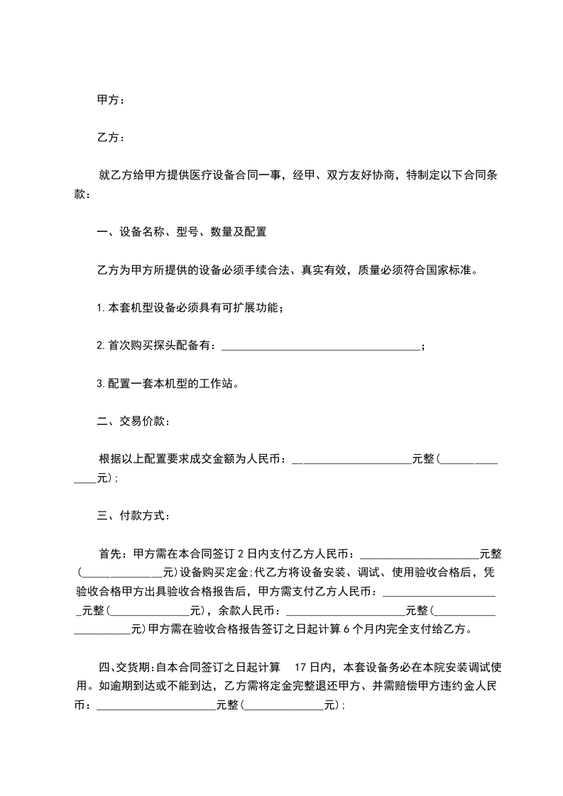 就乙方给甲方提供医疗设备合同一事,经甲、双方友好协商,特制定以下合同条款: