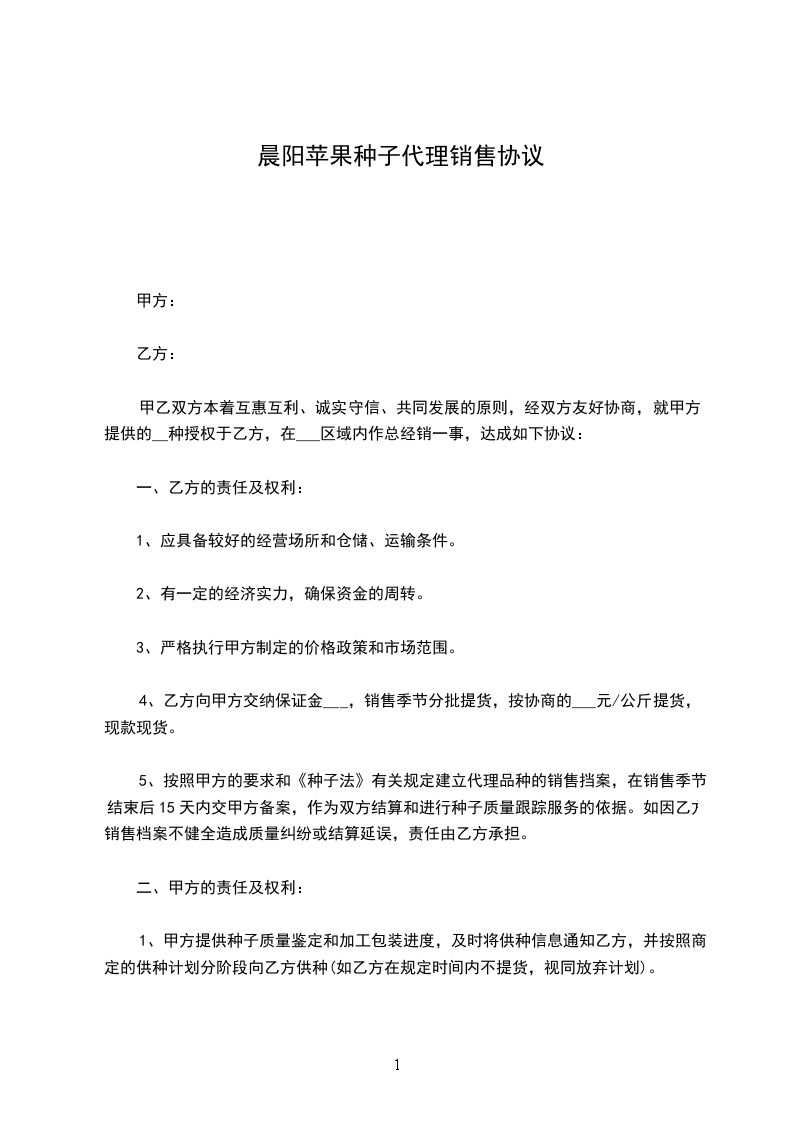 二、甲方同意乙方在区域内独家代理销售甲方“爱玉并负责该区域的宣传、售后服务以及新品种的实验、示范。维护所在区域的市场秩序,乙方未经甲方授权不得将种子销售到委托区域范围外,否则取消代理权。
