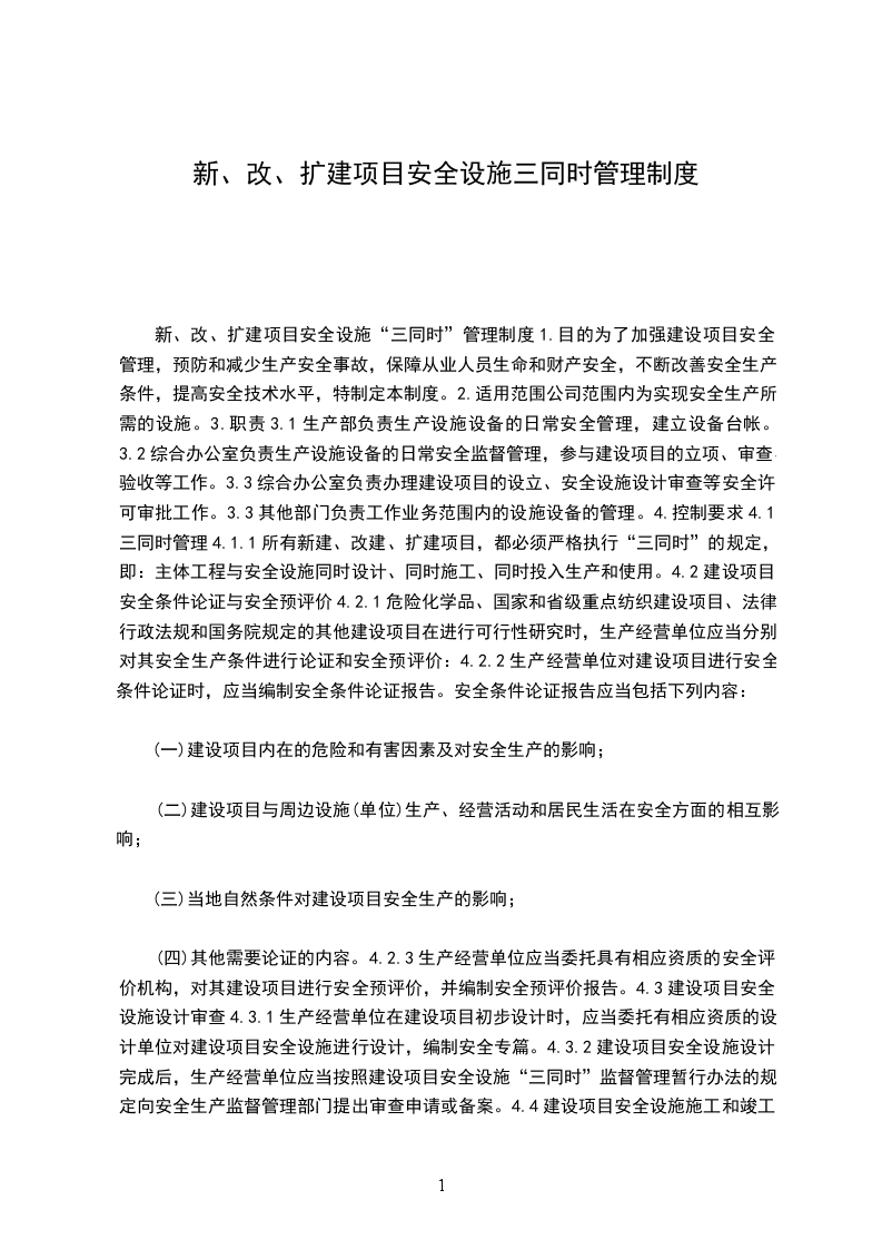 新、改、扩建项目安全设施“三同时”管理制度1.目的为了加强建设项目安全管理,预防和减少生产安全事故,保障从业人员生命和财产安全,不断改善安全生产条件,提高安全技术水平,特制定本制度。2.适用范围公司范围内为实现安全生产所需的设施。3.职责3.1生产部负责生产设施设备的日常安全管理,建立设备台帐。3.2综合办公室负责生产设施设备的日常安全监督管理,参与建设项目的立项、审查、验收等工作。3.3综合办公室负责办理建设项目的设立、安全设施设计审查等安全许可审批工作。3.3其他部门负责工作业务范围内的设施设备的管理。4.控制要求4.1三同时管理4.1.1所有新建、改建、扩建项目,都必须严格执行“三同时”的规定,即:主体工程与安全设施同时设计、同时施工、同时投入生产和使用。4.2建设项目安全条件论证与安全预评价4.2.1危险化学品、国家和省级重点纺织建设项目、法律、行政法规和国务院规定的其他建设项目在进行可行性研究时,生产经营单位应当分别对其安全生产条件进行论证和安全预评价:4.2.2生产经营单位对建设项目进行安全条件论证时,应当编制安全条件论证报告。安全条件论证报告应当包括下列内容: