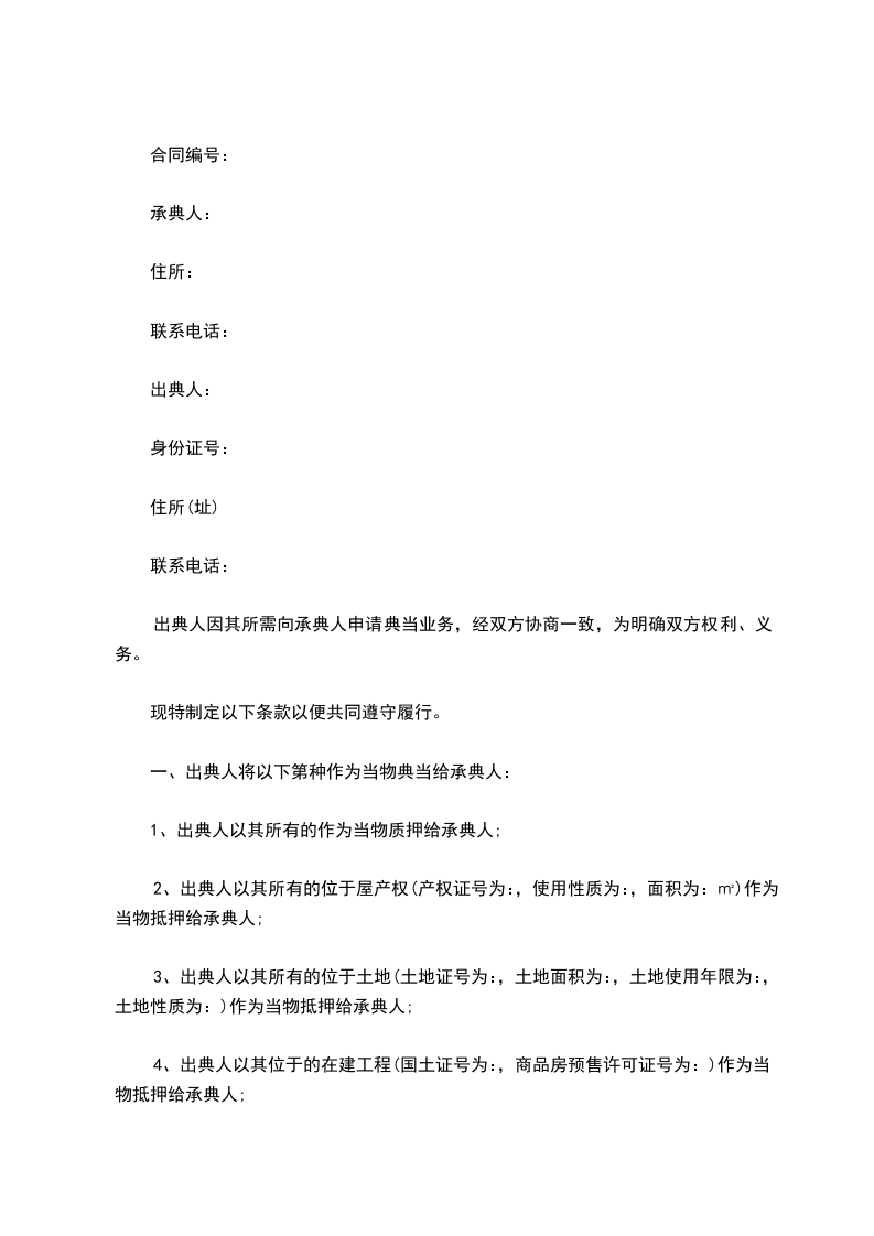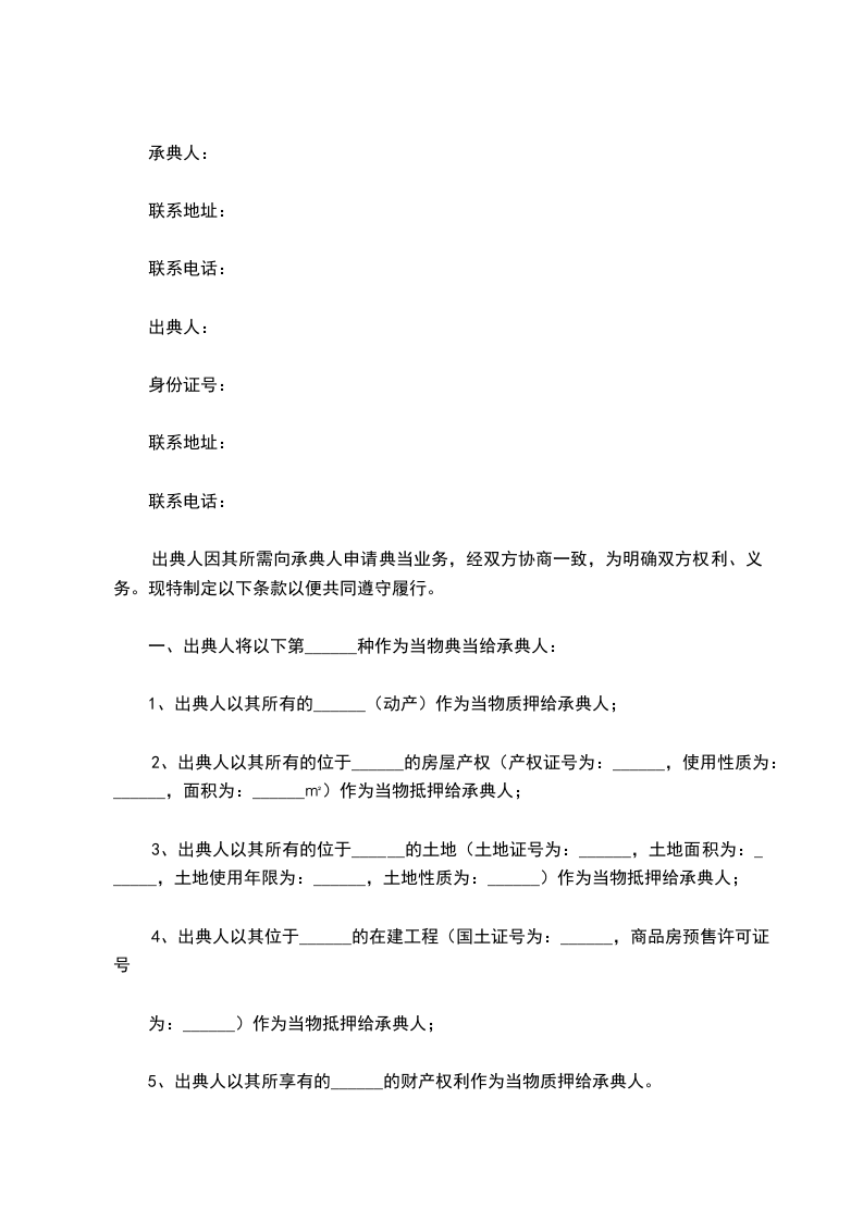 2、出典人以其所有的位于______的房屋产权(产权证号为:______,使用性质为:______,面积为:______㎡)作为当物抵押给承典人;