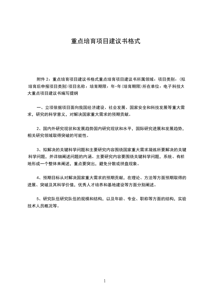 附件2:重点培育项目建议书格式重点培育项目建议书所属领域:项目类别:(拟培育后申报项目类别)项目名称:培育期限:年-年(培育期限)所在单位:电子科技大大重点项目建议书编写提纲