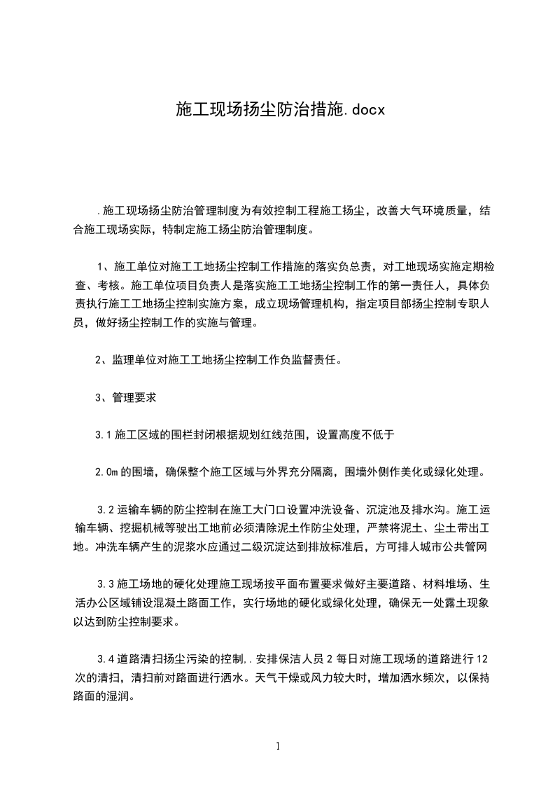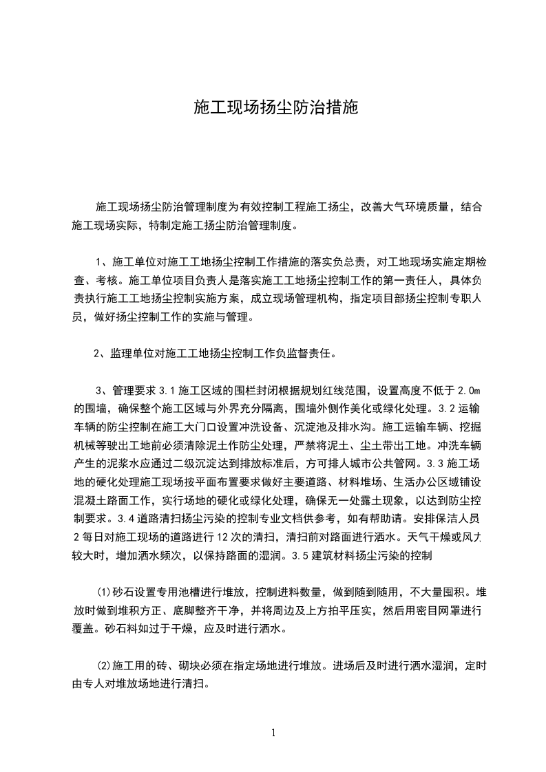 第一章编制依据根据市扬尘污染防治管理暂行规定、中华人民共和国环境保护法、中华人民共和国固体废物污染环境防治法、中华人民共和国大气污染防治法、严格控制主城区建筑施工扬尘污染暂行工作方案等强制规定和有关文明施工的规范,我公司特制定扬尘污染控制方案,以确保本公司各项目部均能达到施工扬尘的标准,以及施工现场良好的工地面貌。