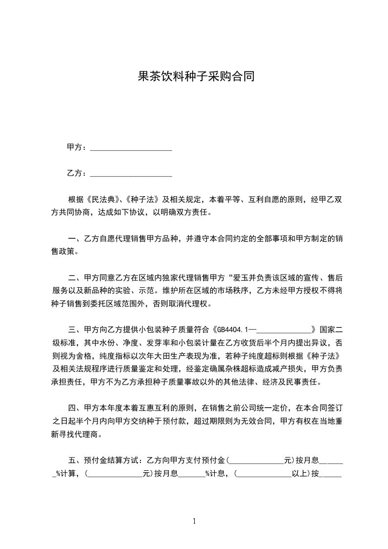 三、甲方向乙方提供小包装种子质量符合《GB44O4.1—______________》国家二级标准,其中水份、净度、发芽率和小包装计量在乙方收货后半个月内提出异议,否则视为舍格,纯度指标以次年大田生产表现为准,若种子纯度超标则根据《种子法》及相关法规程序进行质量鉴定和处理,经鉴定确属杂株超标造成减产损失,甲方负责承担责任,甲方不为乙方承担种子质量事故以外的其他法律、经济及民事责任。