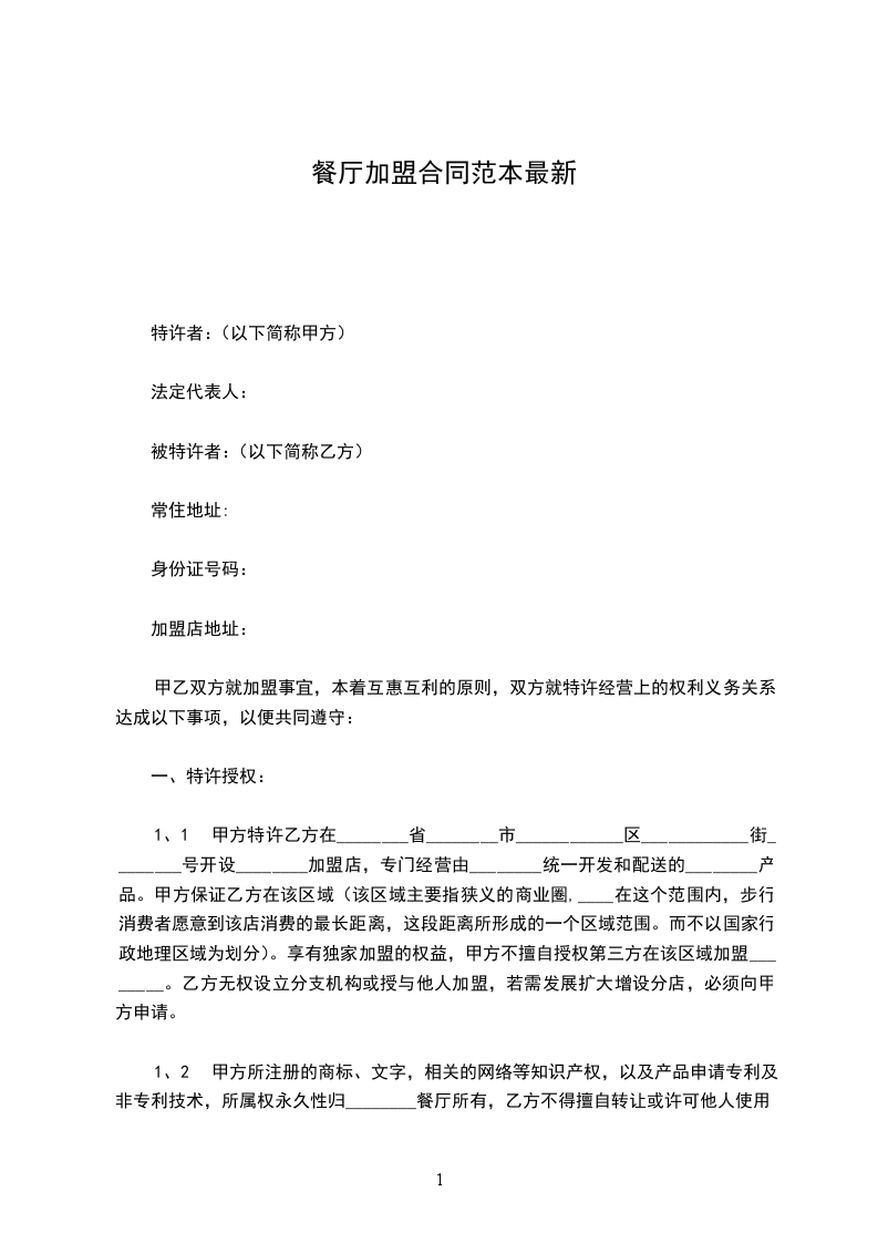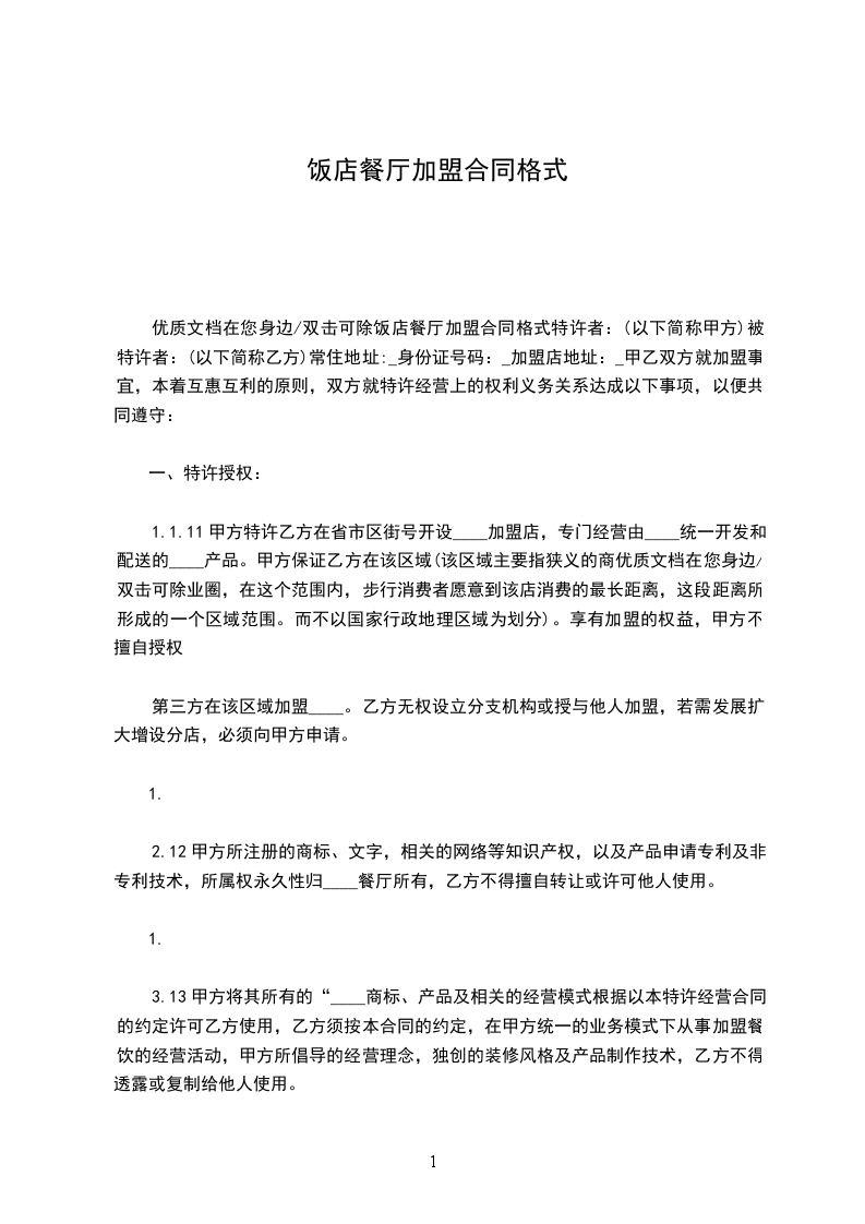1、1 甲方特许乙方在________省________市____________区____________街________号开设________加盟店,专门经营由________统一开发和配送的________产品。甲方保证乙方在该区域(该区域主要指狭义的商业圈,____在这个范围内,步行消费者愿意到该店消费的最长距离,这段距离所形成的一个区域范围。而不以国家行政地理区域为划分)。享有独家加盟的权益,甲方不擅自授权第三方在该区域加盟________。乙方无权设立分支机构或授与他人加盟,若需发展扩大增设分店,必须向甲方申请。