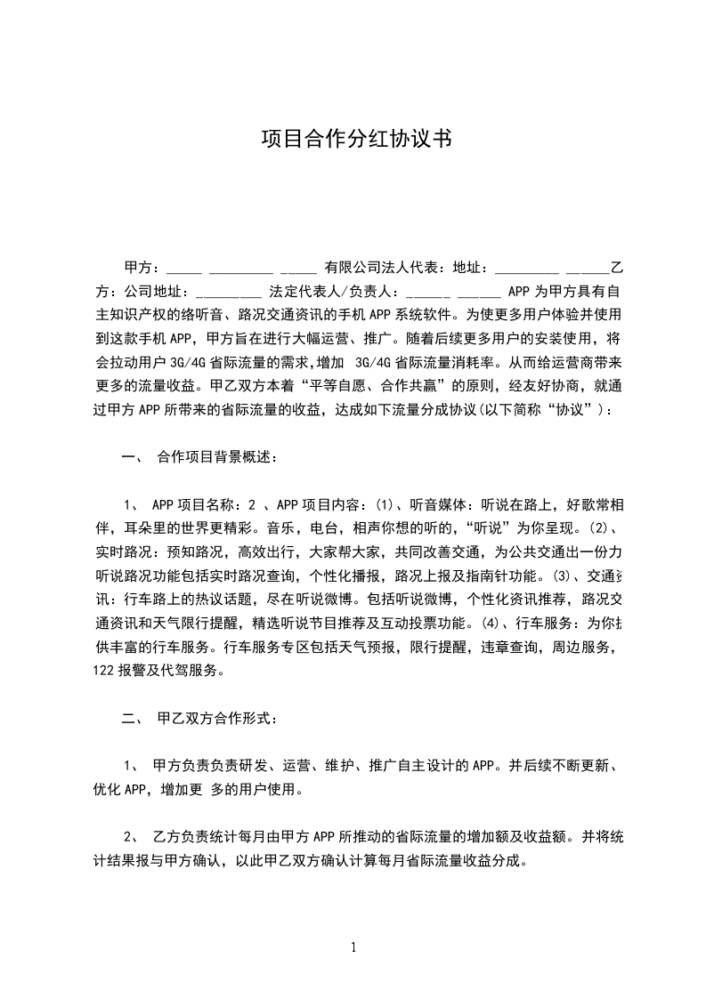 甲方:_____ _________ _____ 有限公司法人代表:地址:_________ ______乙 方:公司地址:_________ 法定代表人/负责人:______ ______ APP为甲方具有自主知识产权的络听音、路况交通资讯的手机APP系统软件。为使更多用户体验并使用到这款手机APP,甲方旨在进行大幅运营、推广。随着后续更多用户的安装使用,将会拉动用户3G/4G省际流量的需求,增加3G/4G省际流量消耗率。从而给运营商带来更多的流量收益。甲乙双方本着“平等自愿、合作共赢”的原则,经友好协商,就通过甲方APP所带来的省际流量的收益,达成如下流量分成协议(以下简称“协议”):