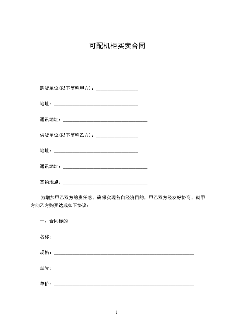 一、甲方同意将自有的__________________(该机编号为:__________________)出售给乙方,经乙方负责人及技术人员现看、试机后,以协定价格为人民币¥:__________________元(__________________元整)。