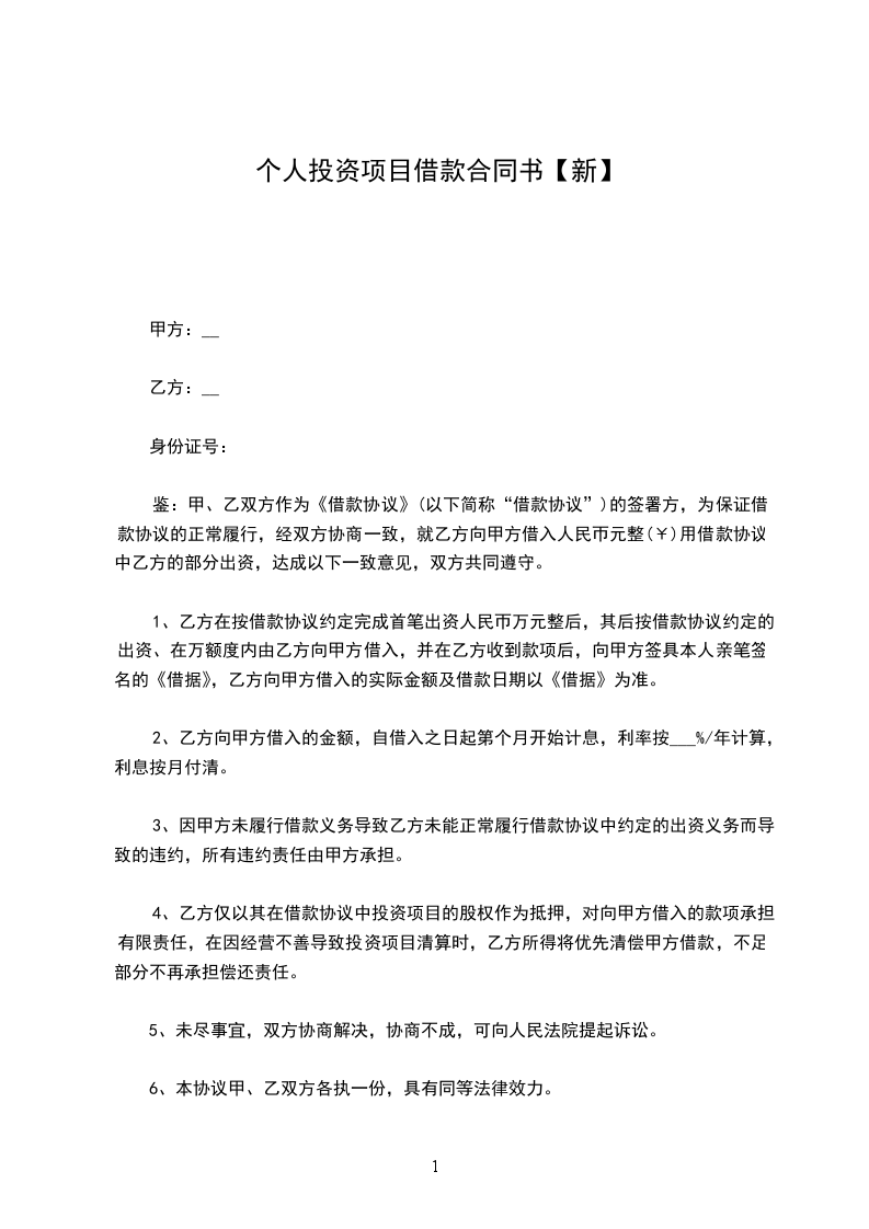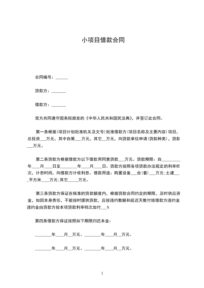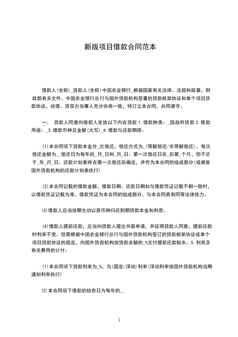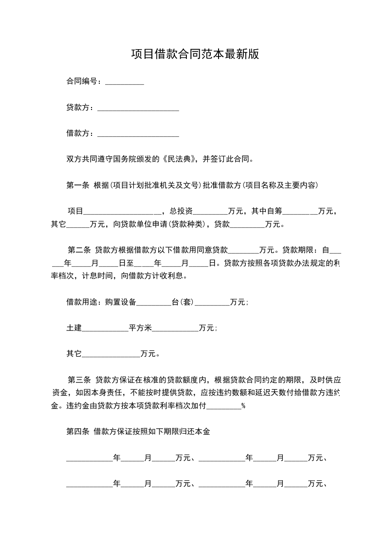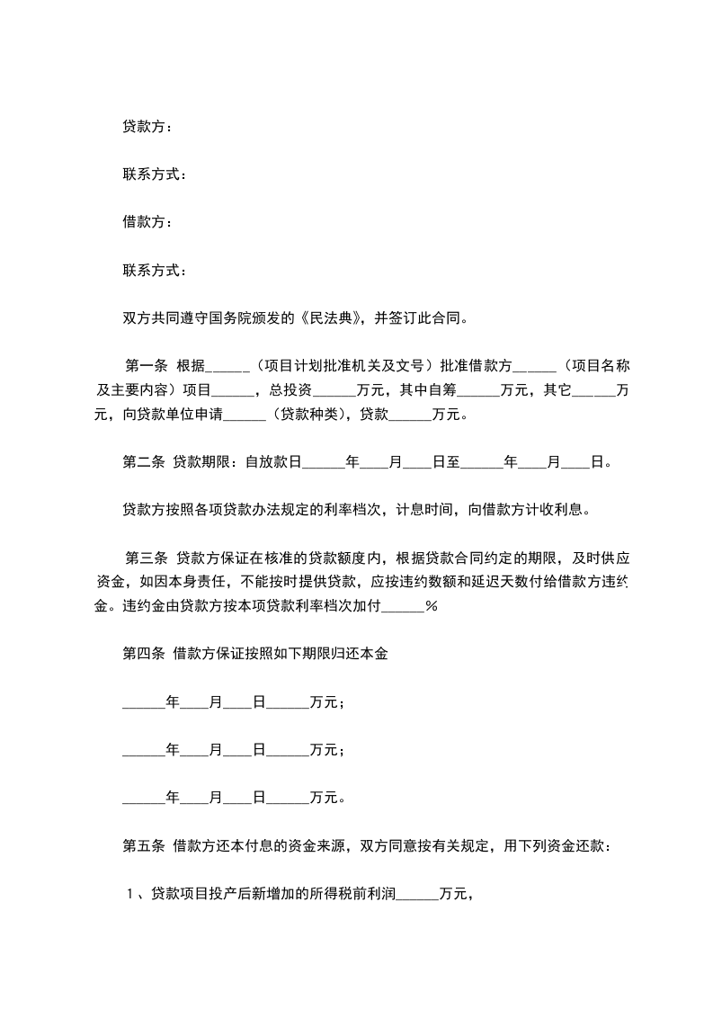 第一条 根据______(项目计划批准机关及文号)批准借款方______(项目名称及主要内容)项目______,总投资______万元,其中自筹______万元,其它______万元,向贷款单位申请______(贷款种类),贷款______万元。