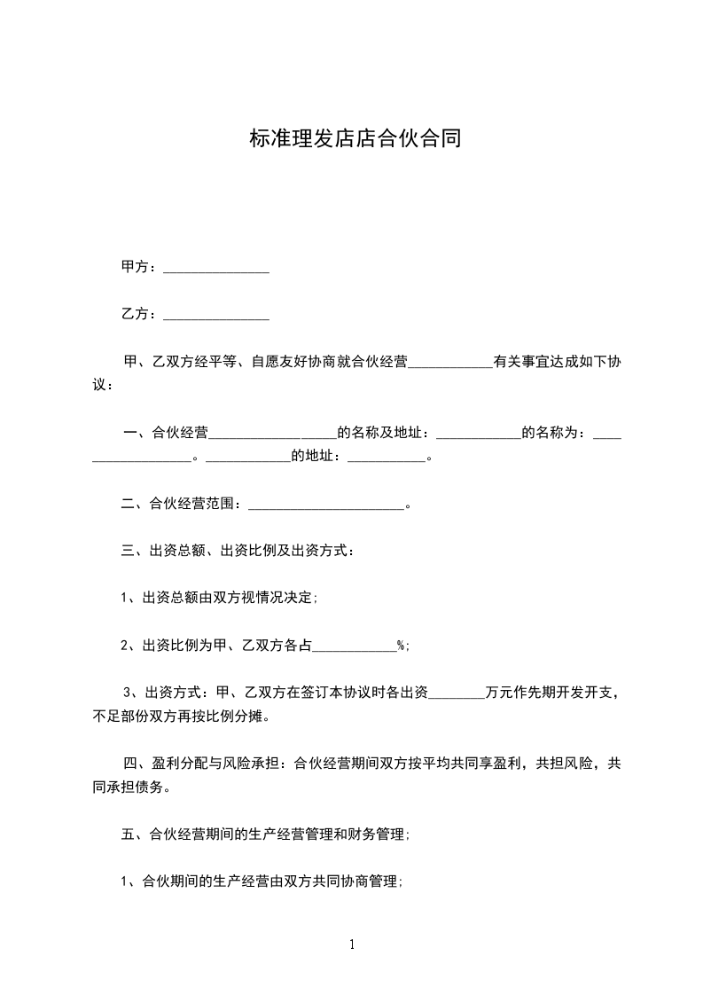 标准理发店店合伙合同