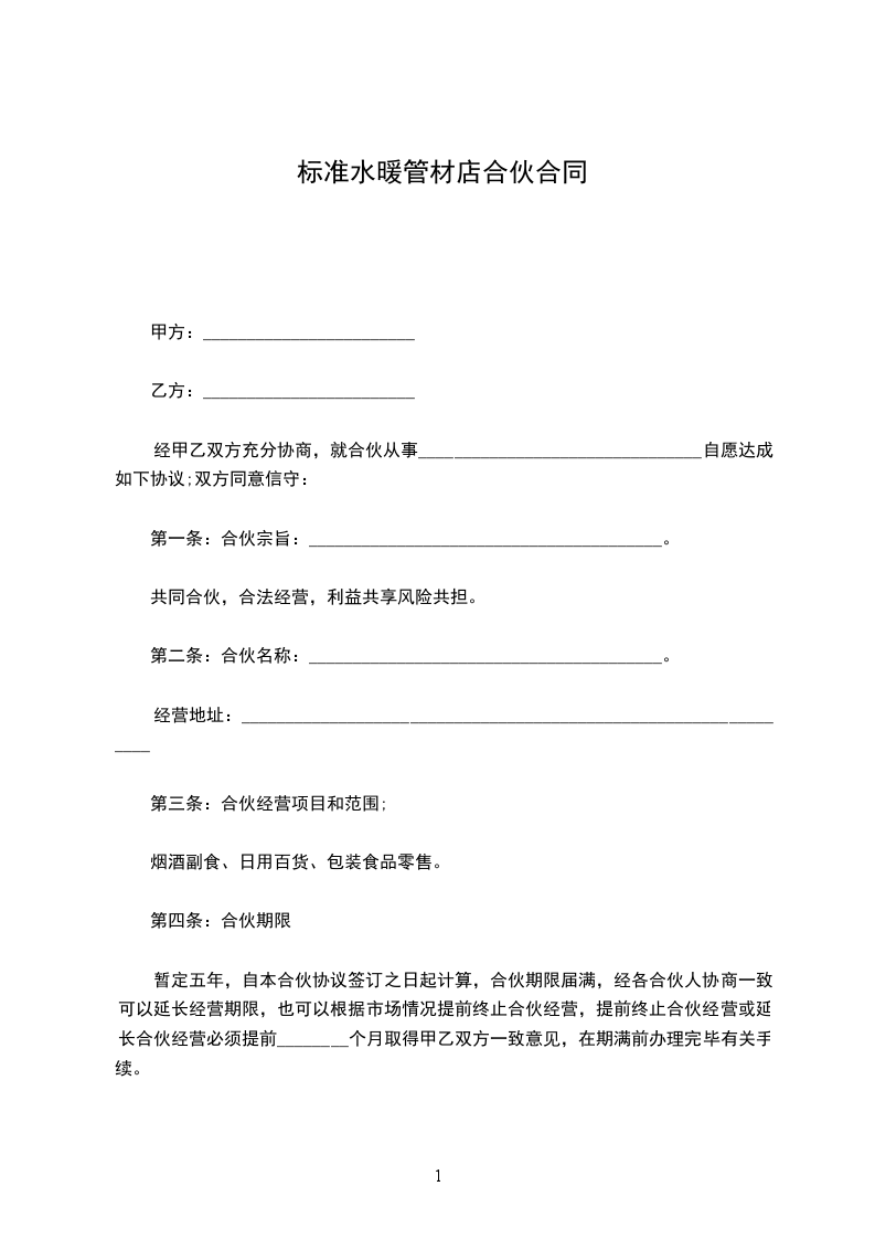 暂定五年,自本合伙协议签订之日起计算,合伙期限届满,经各合伙人协商一致可以延长经营期限,也可以根据市场情况提前终止合伙经营,提前终止合伙经营或延长合伙经营必须提前________个月取得甲乙双方一致意见,在期满前办理完毕有关手续。