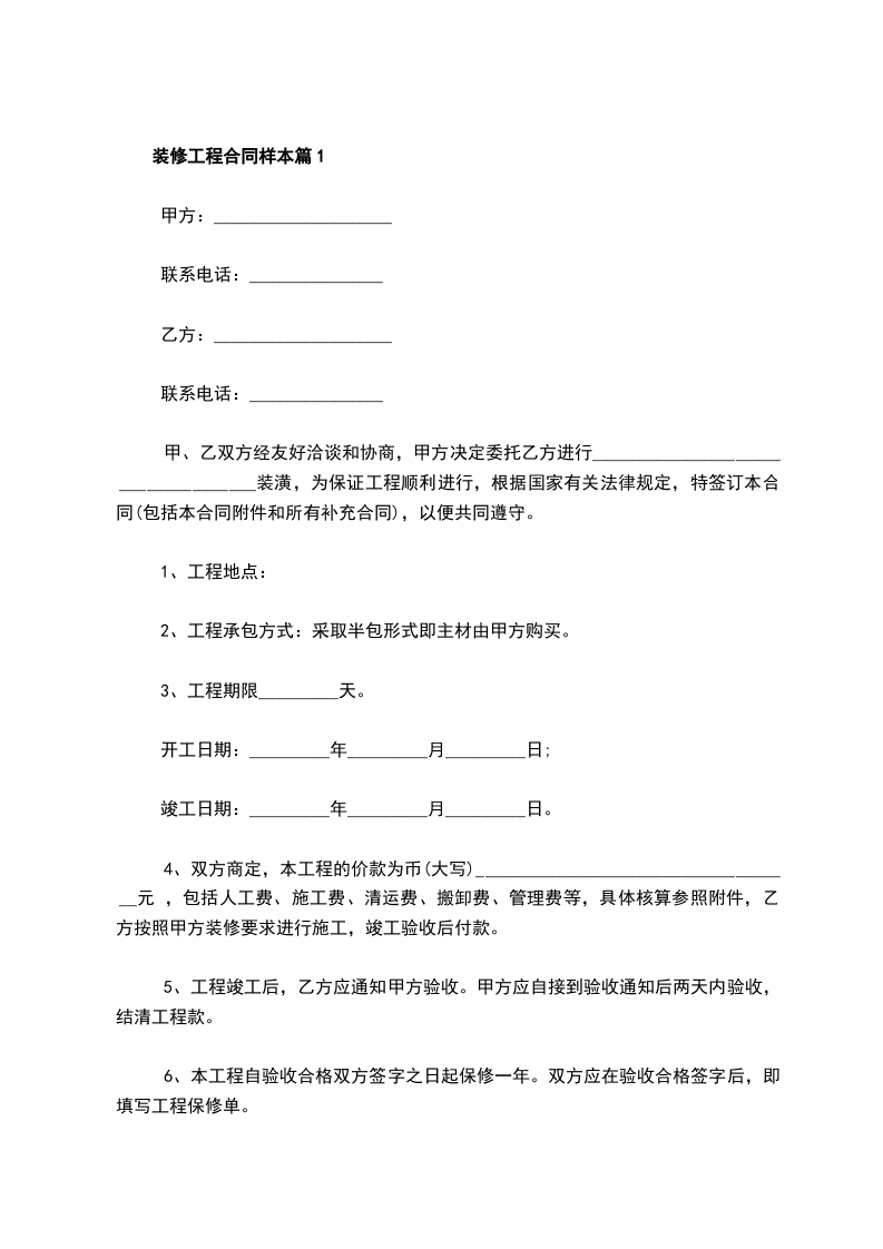 6、本工程自验收合格双方签字之日起保修一年。双方应在验收合格签字后,即填写工程保修单。