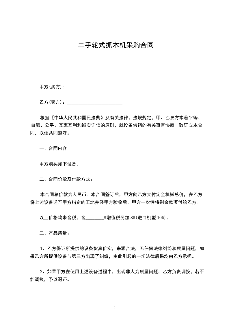 二手轮式抓木机采购合同