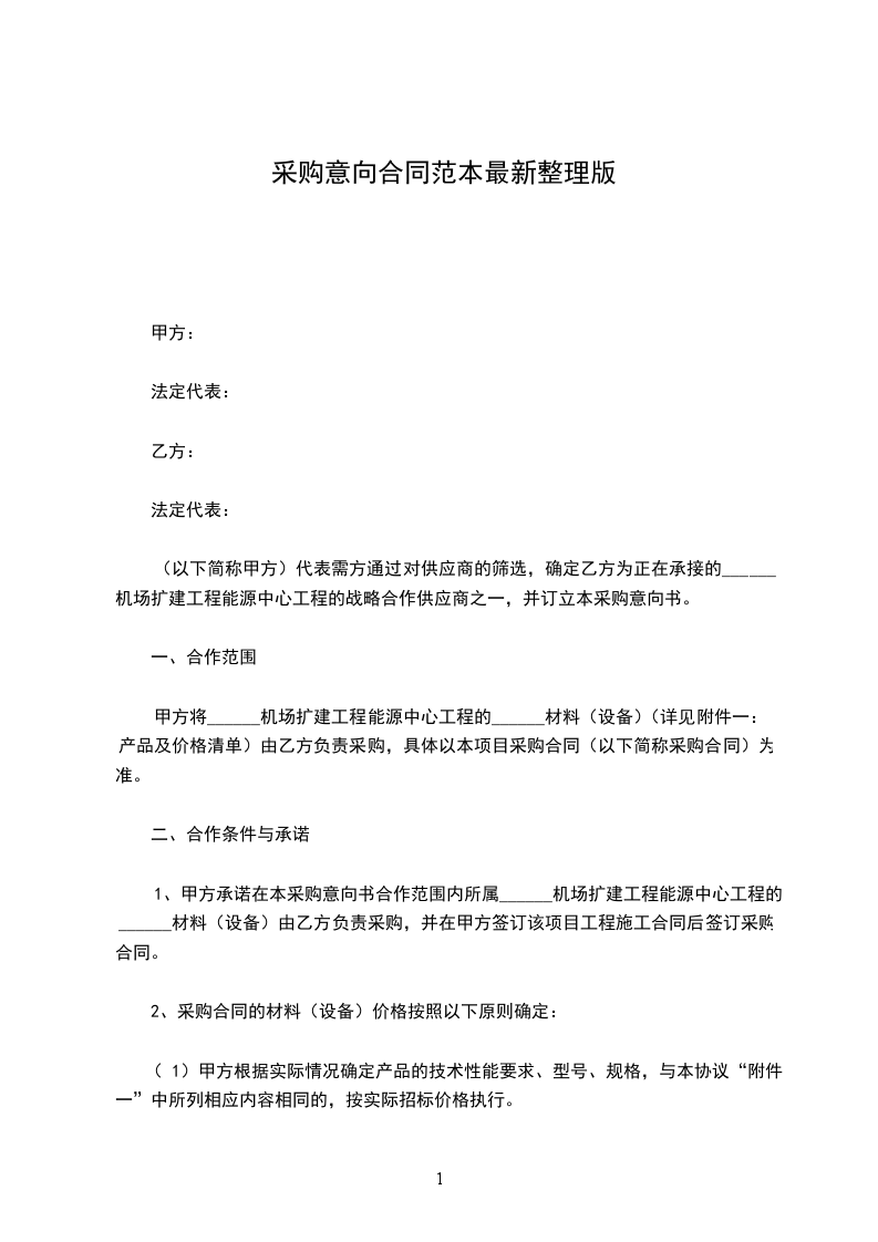 (以下简称甲方)代表需方通过对供应商的筛选,确定乙方为正在承接的______机场扩建工程能源中心工程的战略合作供应商之一,并订立本采购意向书。